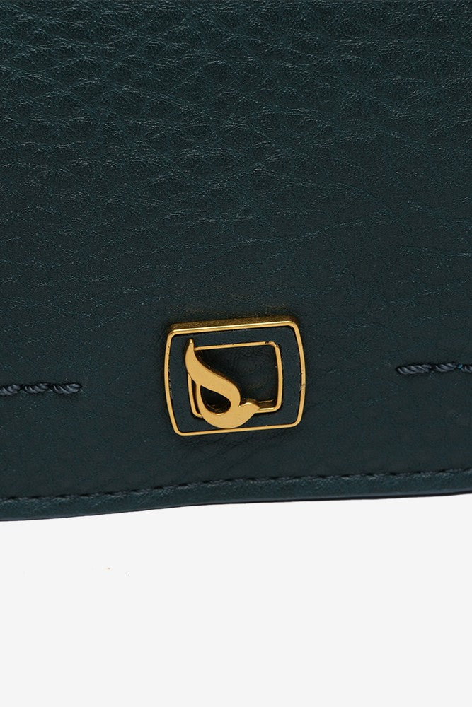 • Details wie Karabinerhaken, Reißverschluss und das Logo der Marke in Goldfarbe.