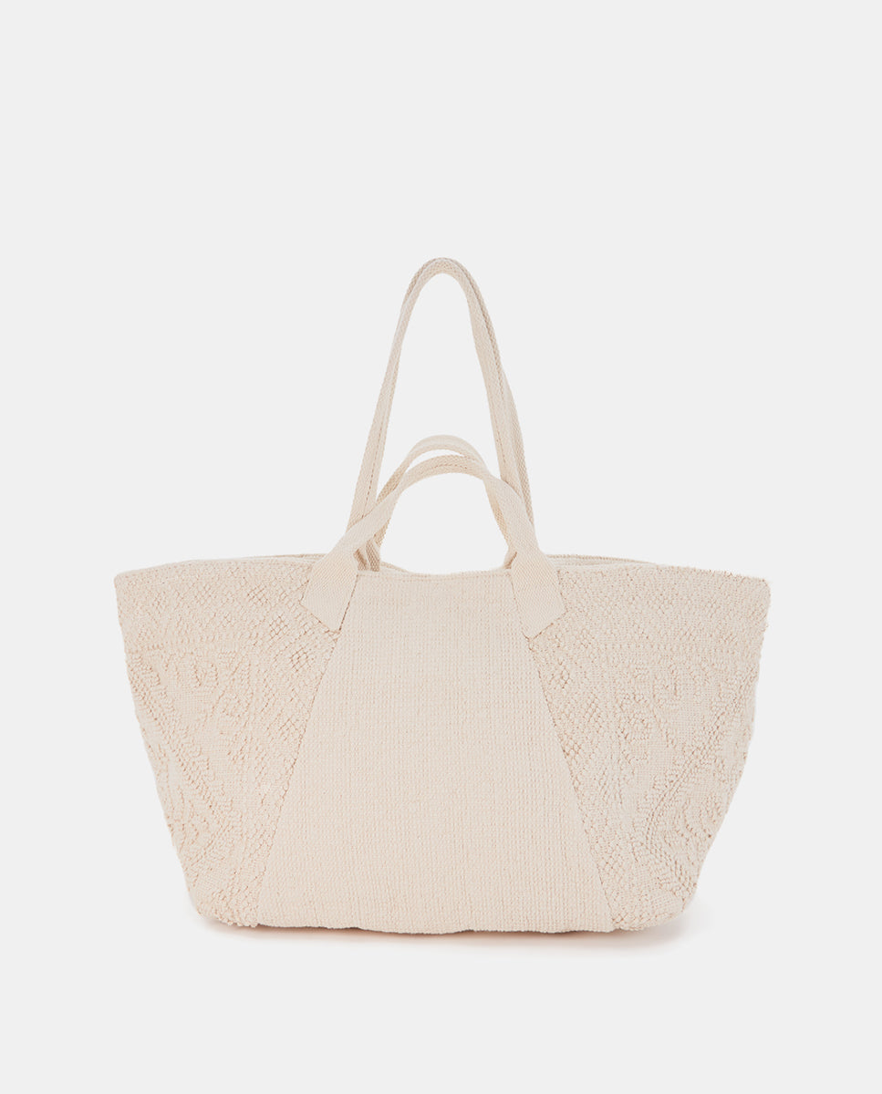 Strandtasche mit großem Fassungsvermögen aus Baumwolle mit einer Stickerei im Ethno-Stil, die für Persönlichkeit und Frische sorgt. Seine Hauptmerkmale sind: