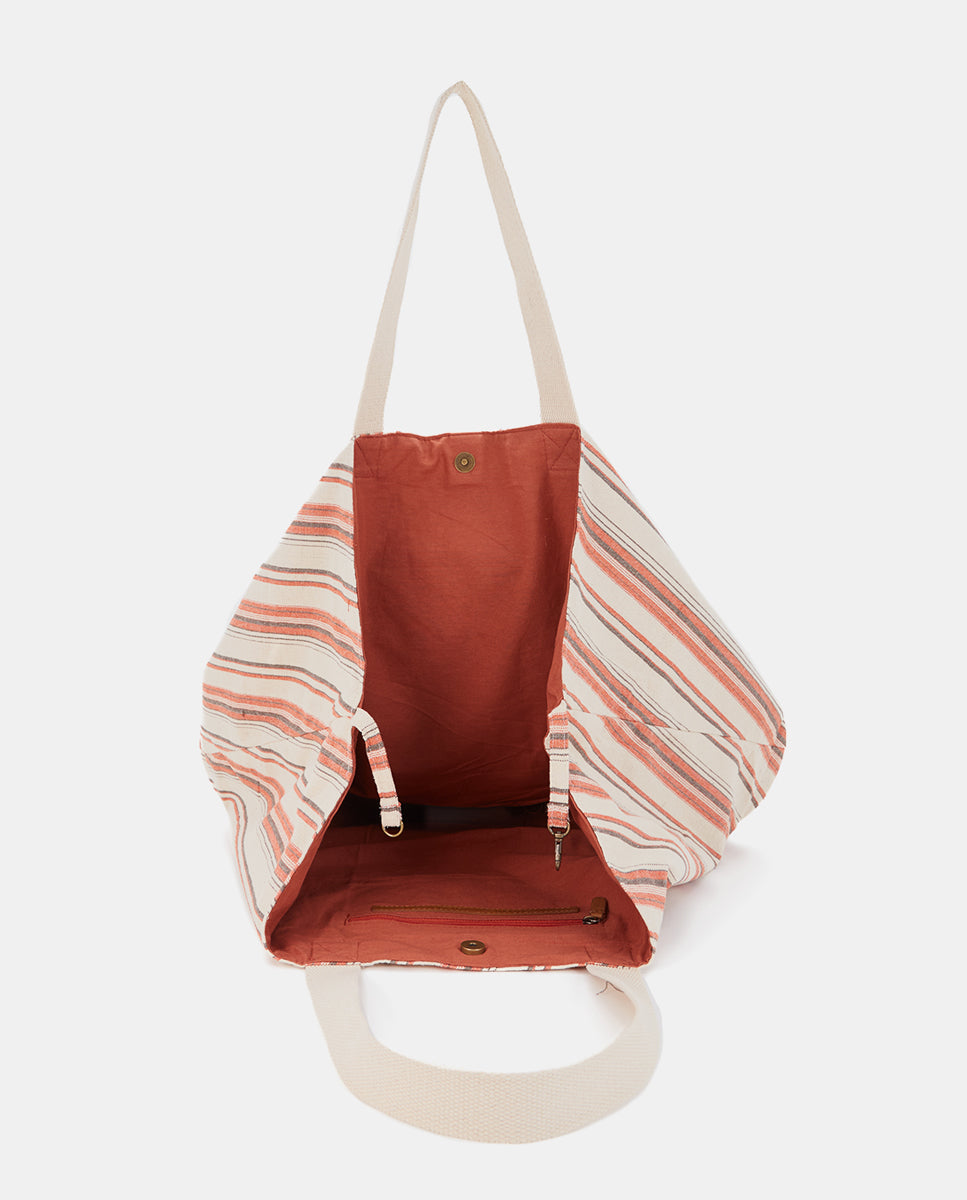 Großvolumige Strandtasche aus 100 % Baumwolle mit lässigem Design und fröhlichem Streifendruck. Seine Hauptmerkmale sind: