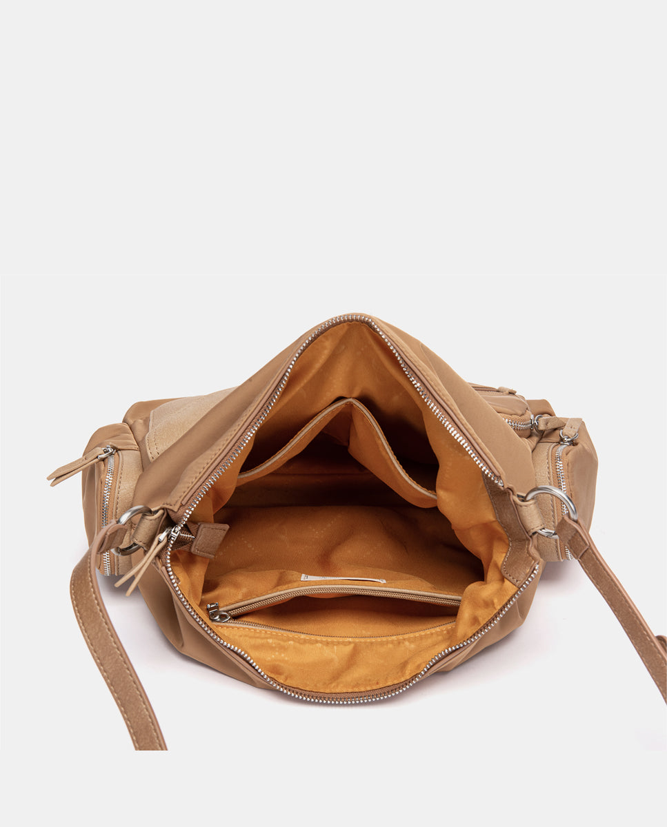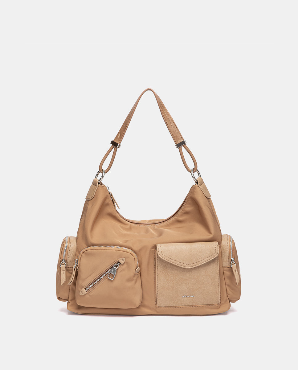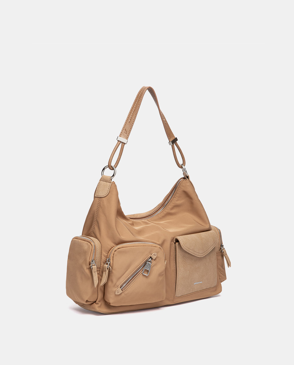 Umhängetasche im Hobo-Stil aus recycelten Stoffen, die zwei verschiedene Texturen kombinieren und hervorragende Funktionalität bieten. Seine Hauptmerkmale sind:
