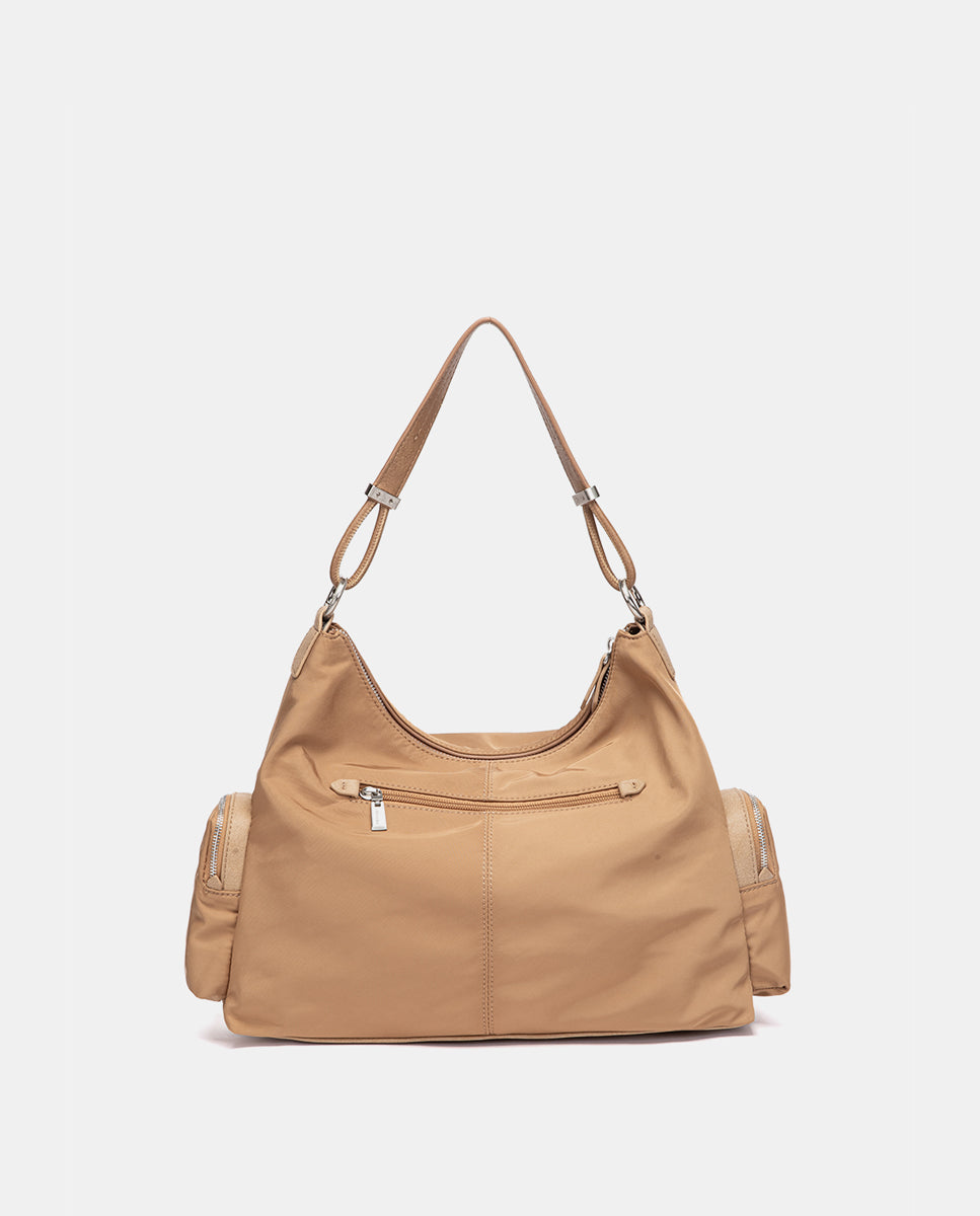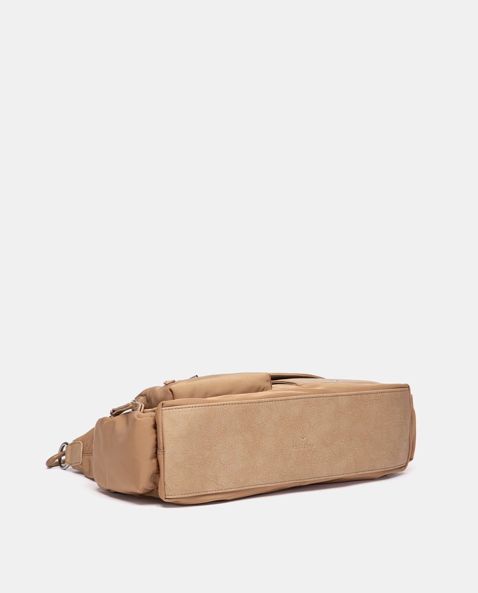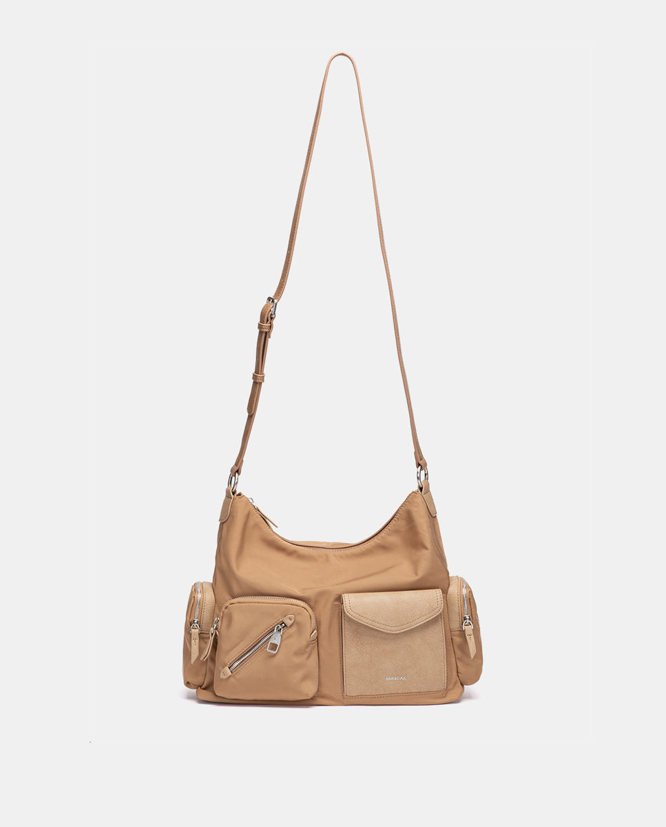 Umhängetasche im Hobo-Stil aus recycelten Stoffen, die zwei verschiedene Texturen kombinieren und hervorragende Funktionalität bieten. Seine Hauptmerkmale sind: