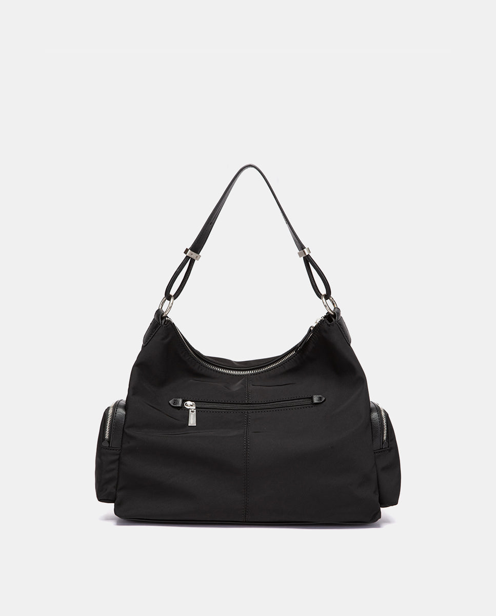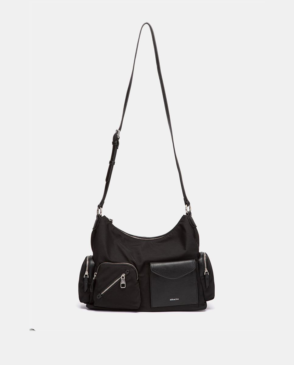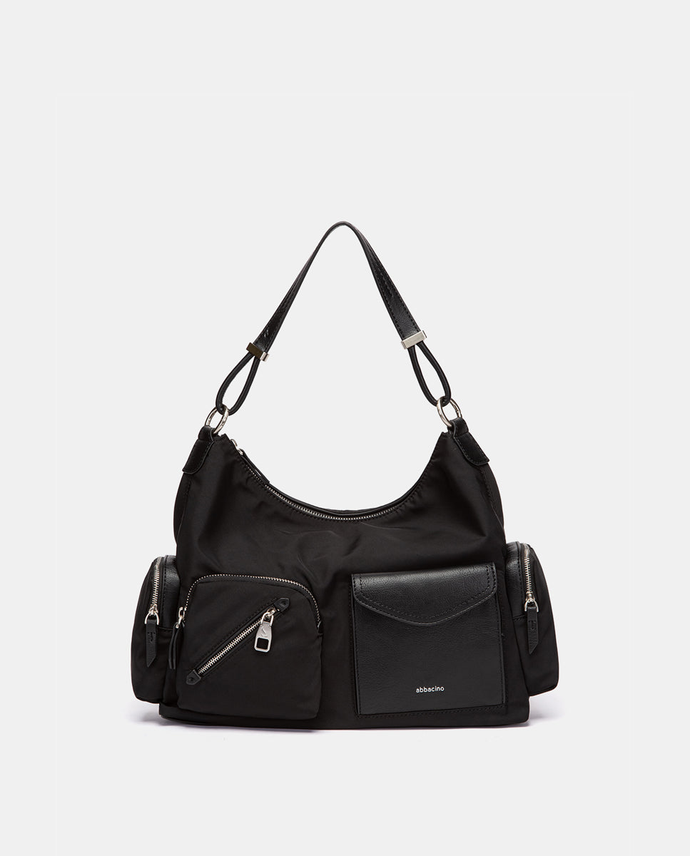 Umhängetasche im Hobo-Stil aus recycelten Stoffen, die zwei verschiedene Texturen kombinieren und hervorragende Funktionalität bieten. Seine Hauptmerkmale sind: