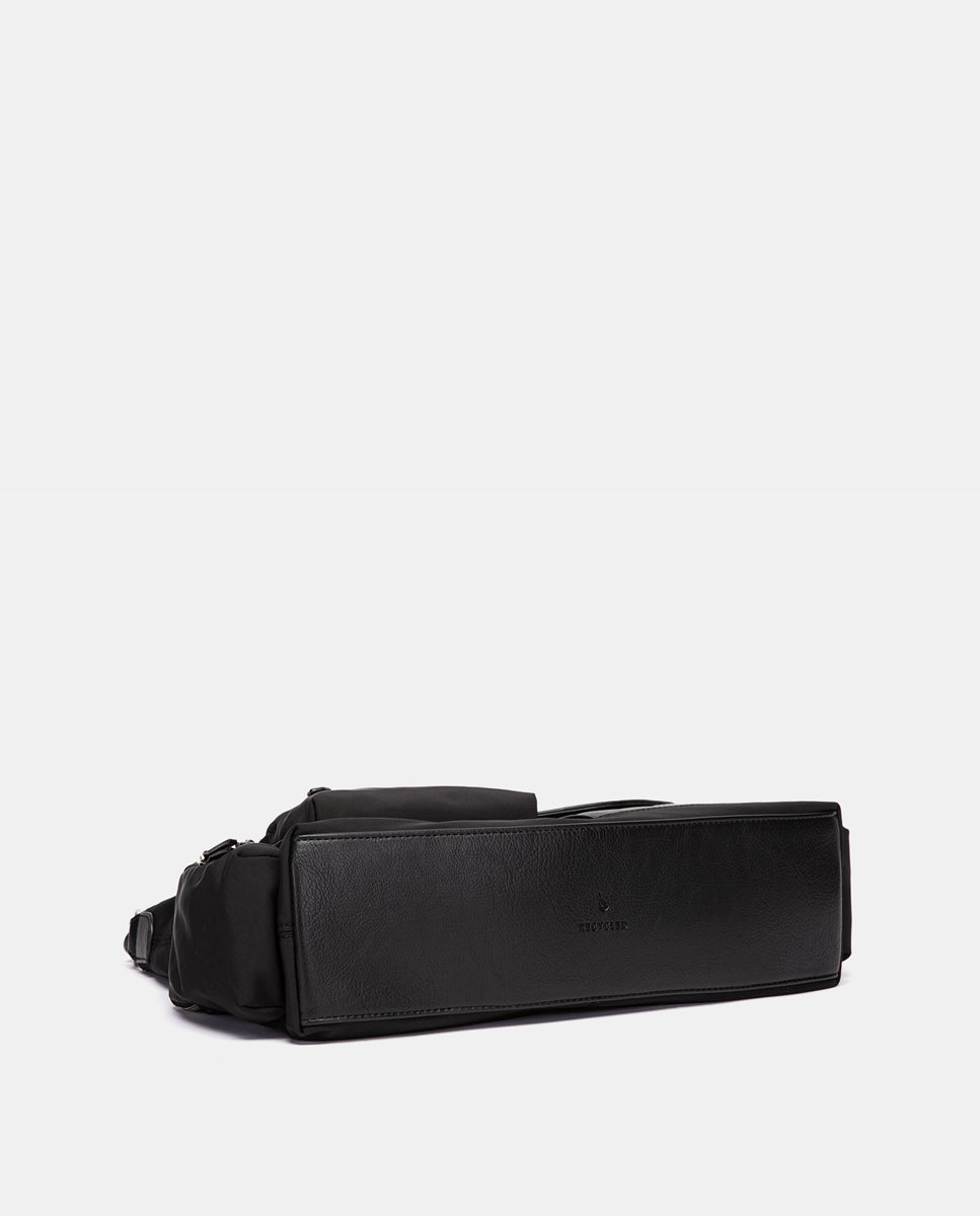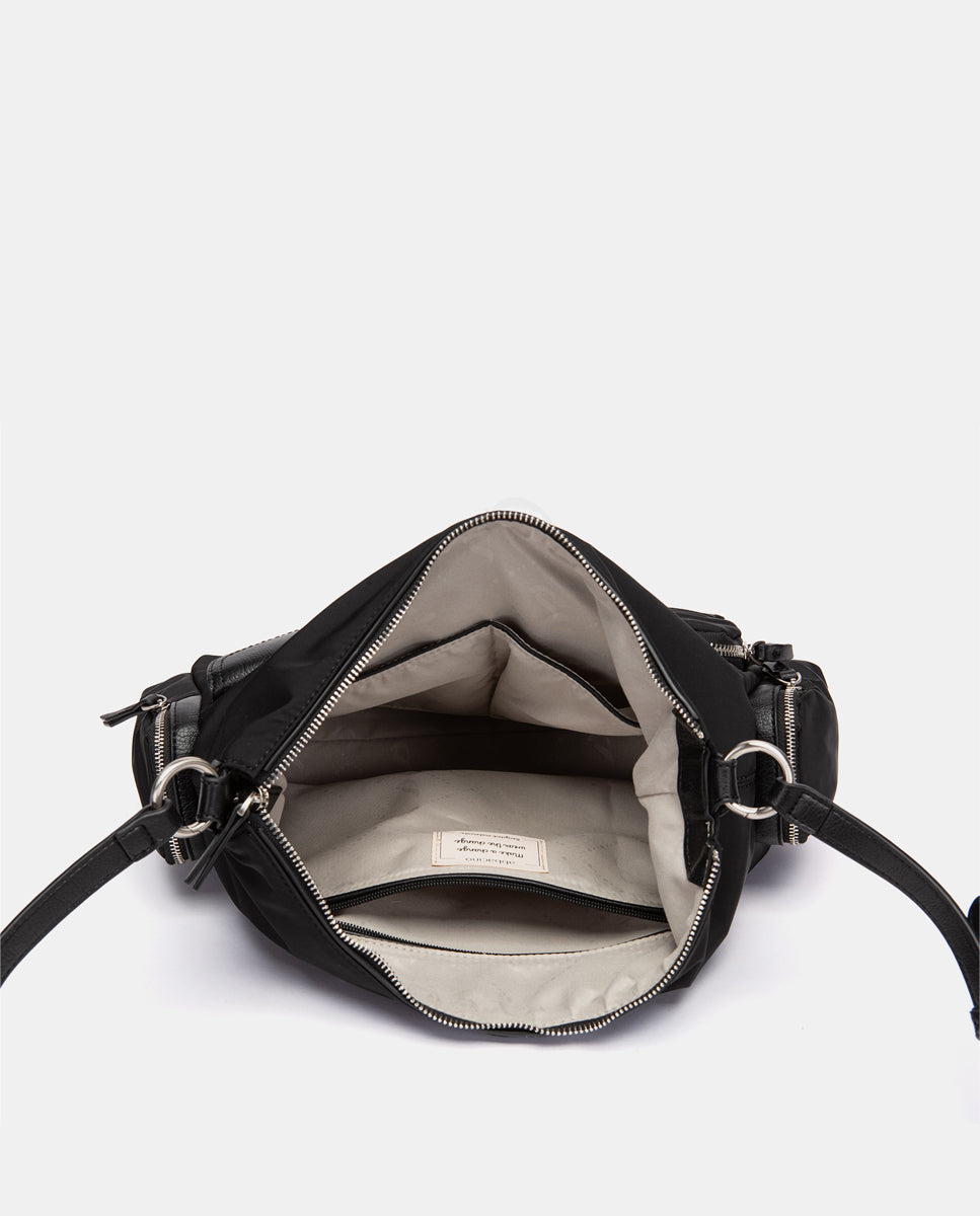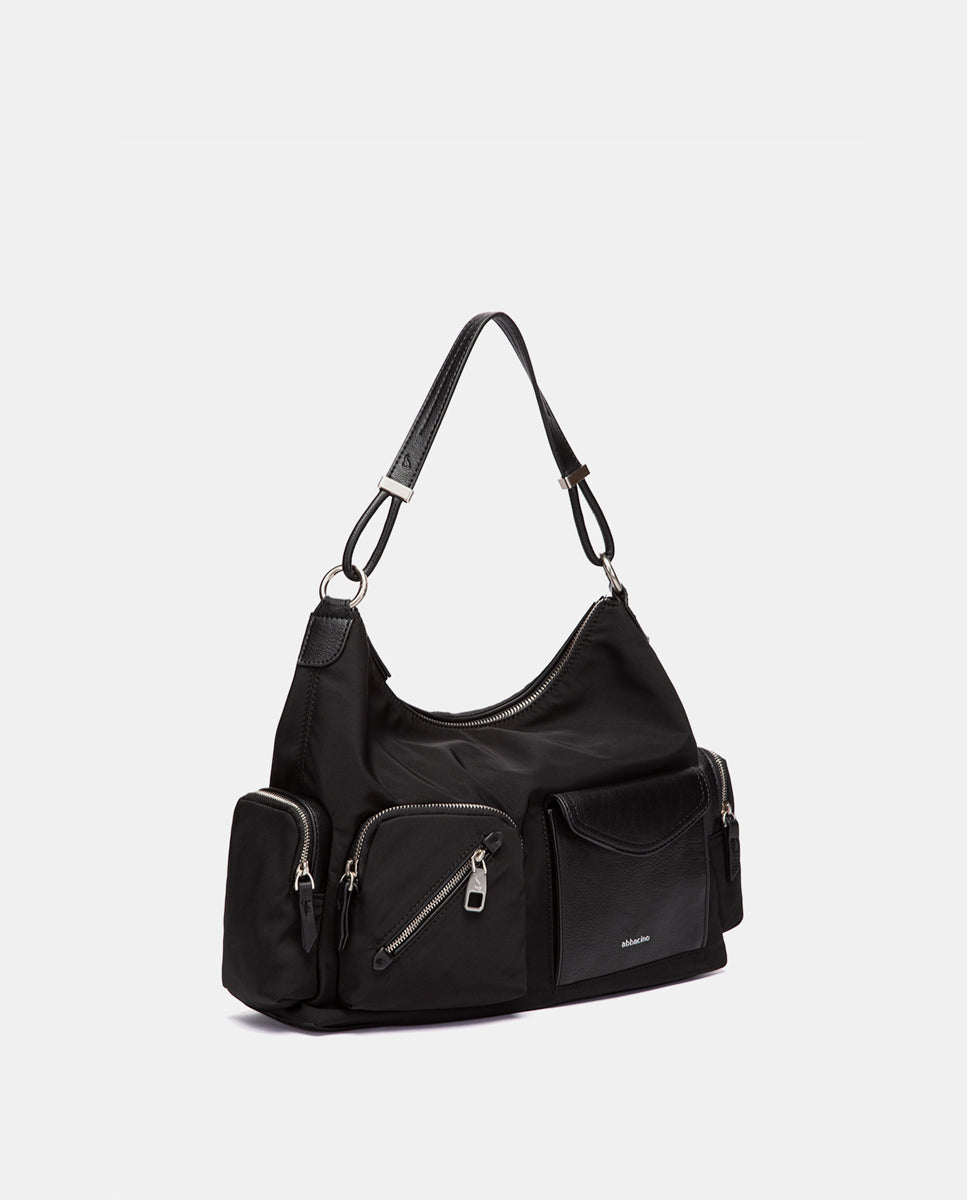 Umhängetasche im Hobo-Stil aus recycelten Stoffen, die zwei verschiedene Texturen kombinieren und hervorragende Funktionalität bieten. Seine Hauptmerkmale sind: