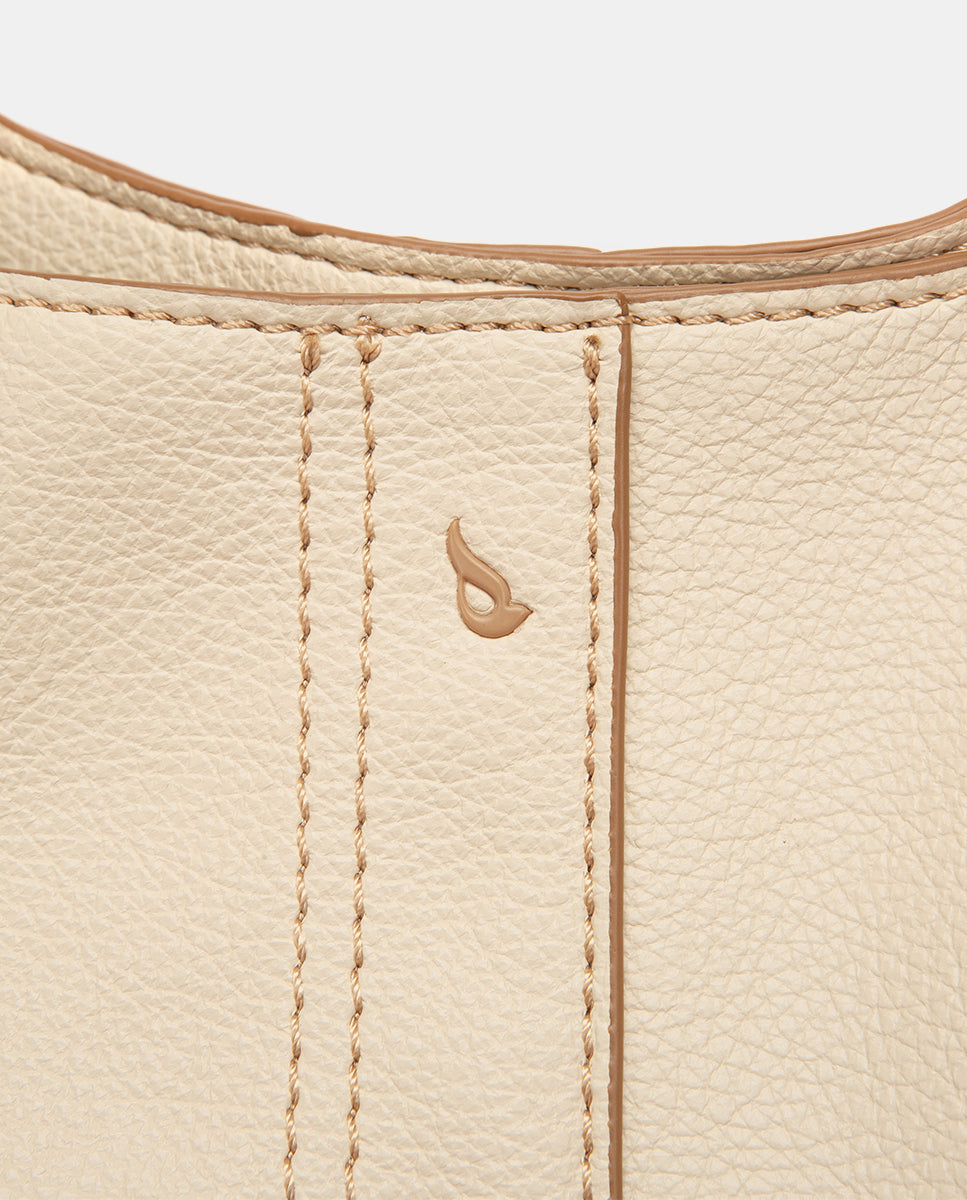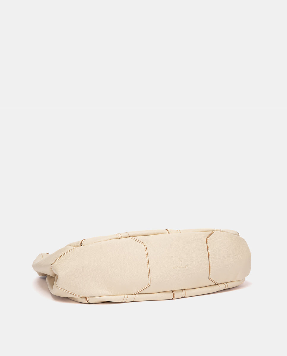 Umhängetasche im Hobo-Stil aus recycelten Materialien mit strukturierter Oberfläche und sichtbaren Nähten, die ihr vielseitiges Design unterstreichen, perfekt für jeden Anlass. Seine Hauptmerkmale sind: