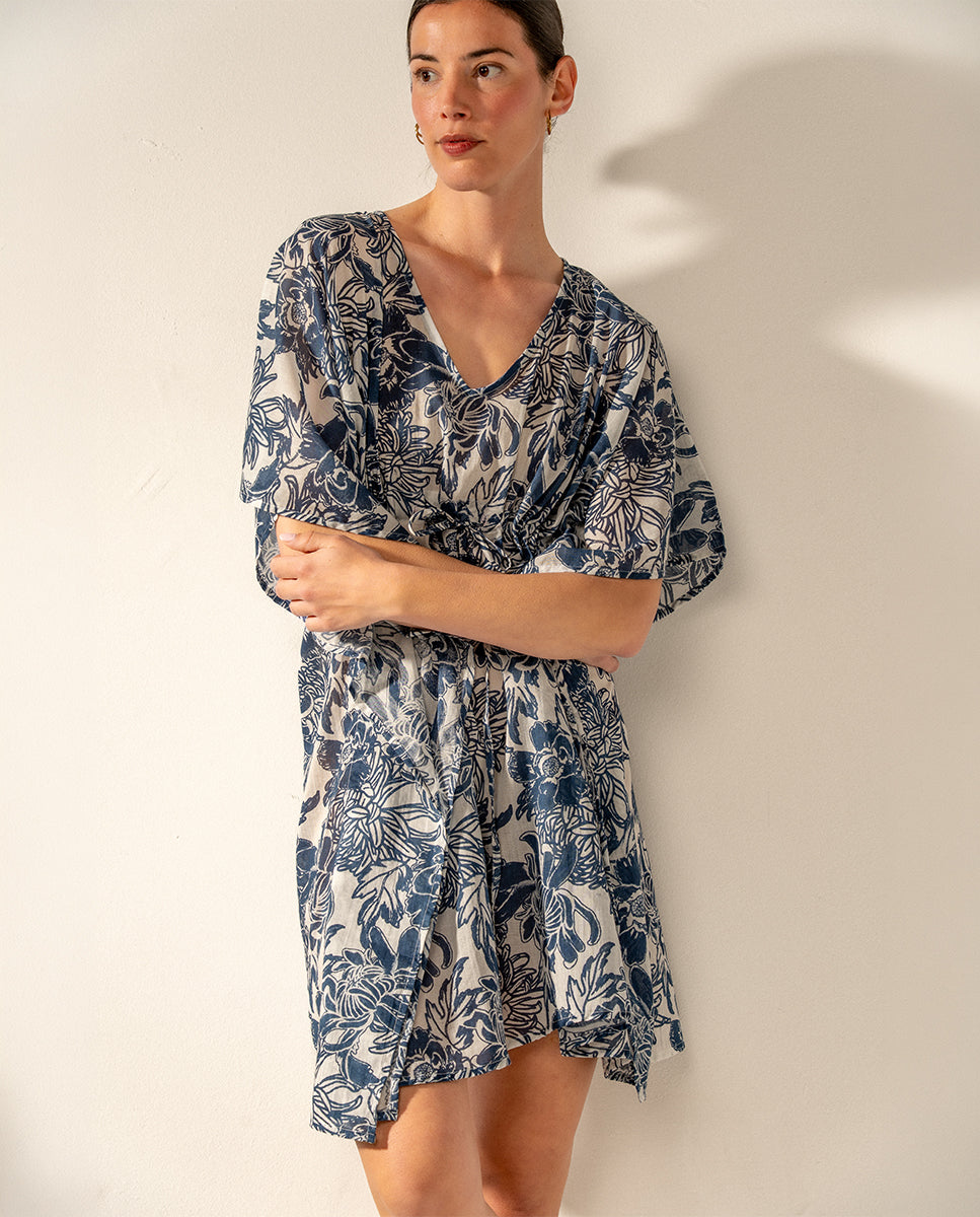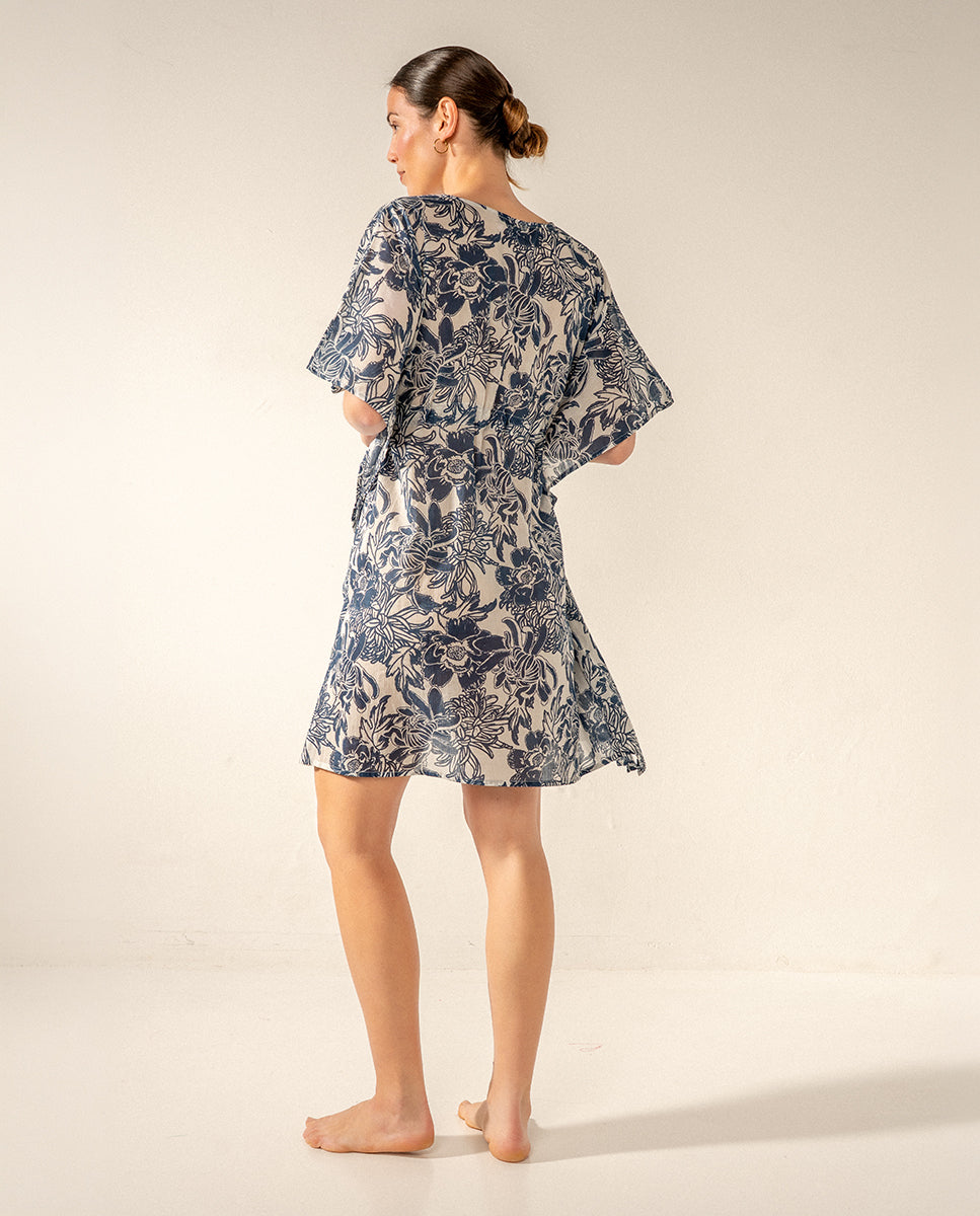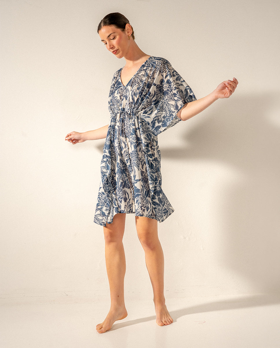 Blauer Baumwoll-Kaftan mit Blumendruck