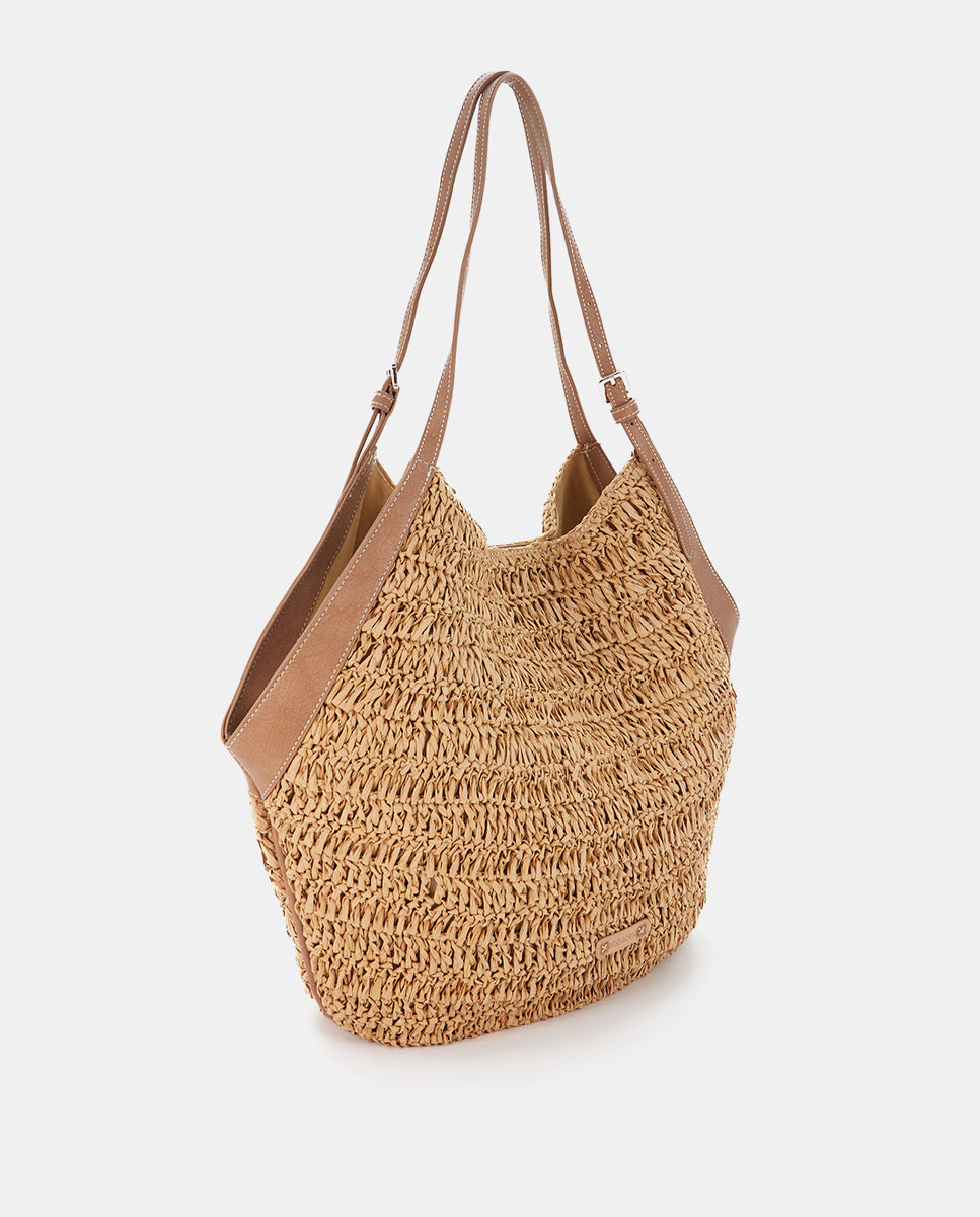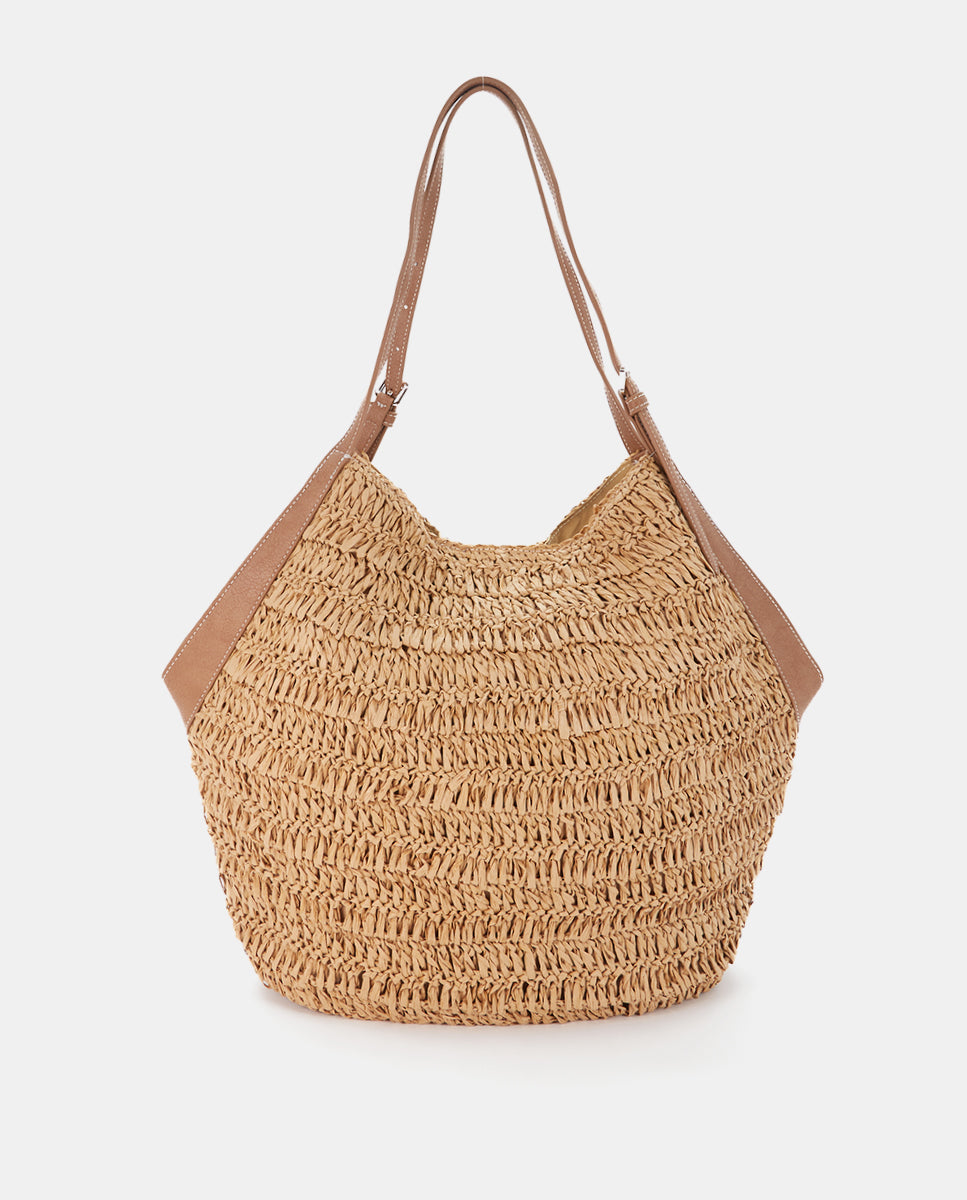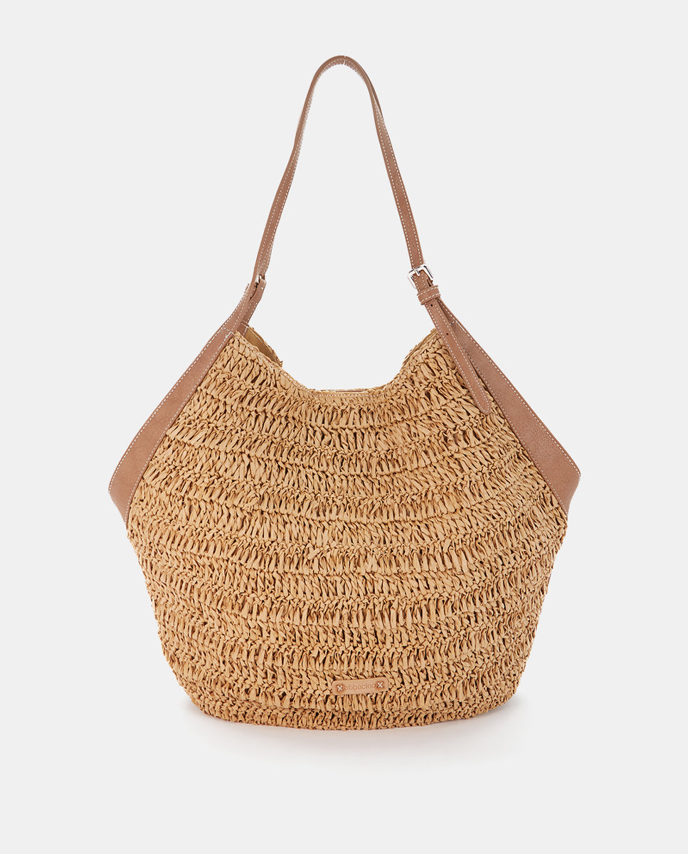 Capazo de rafia con silueta redondeada y diseño natural de inspiración veraniega. Sus principales características son: