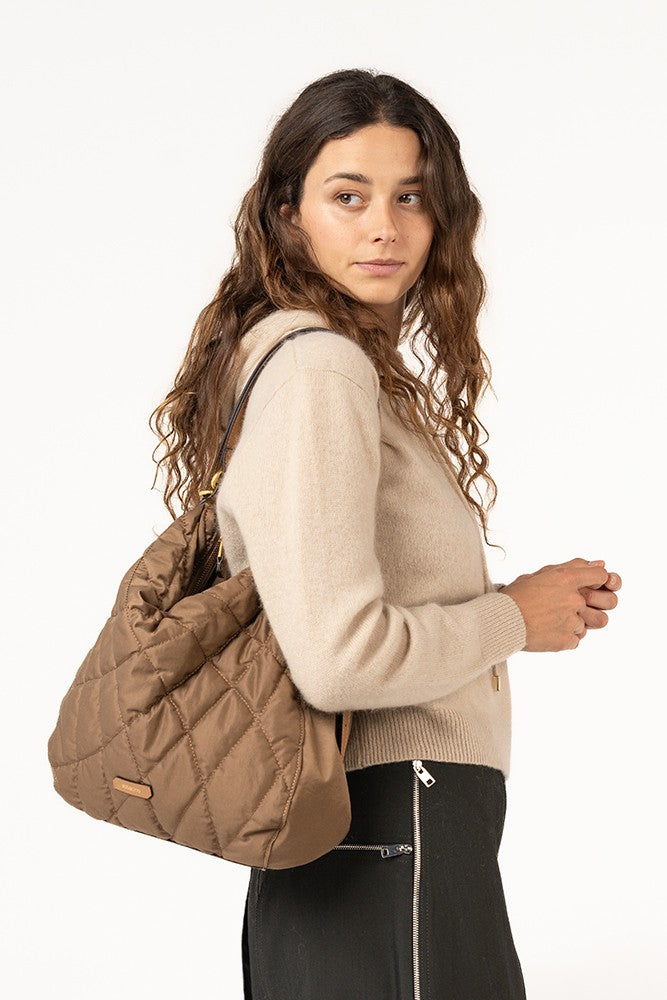 Gepolsterte Tasche-Rucksack aus recycelten Materialien in Camel.