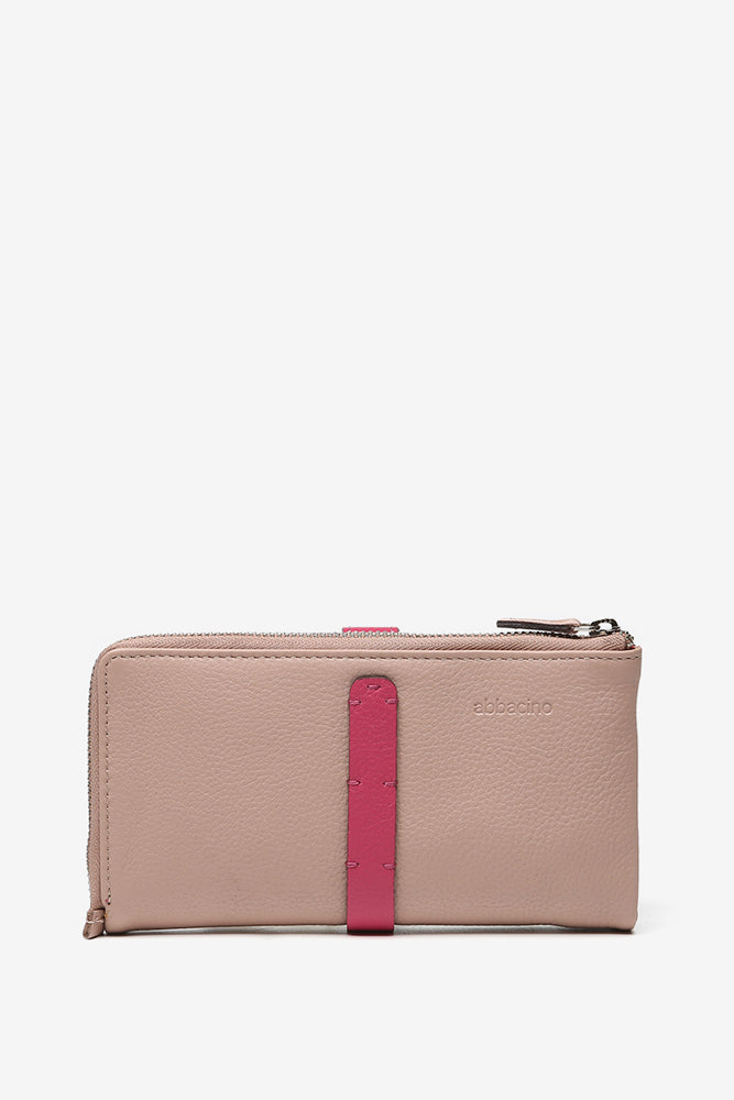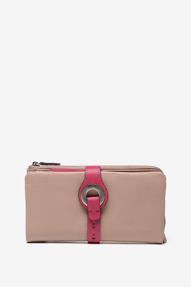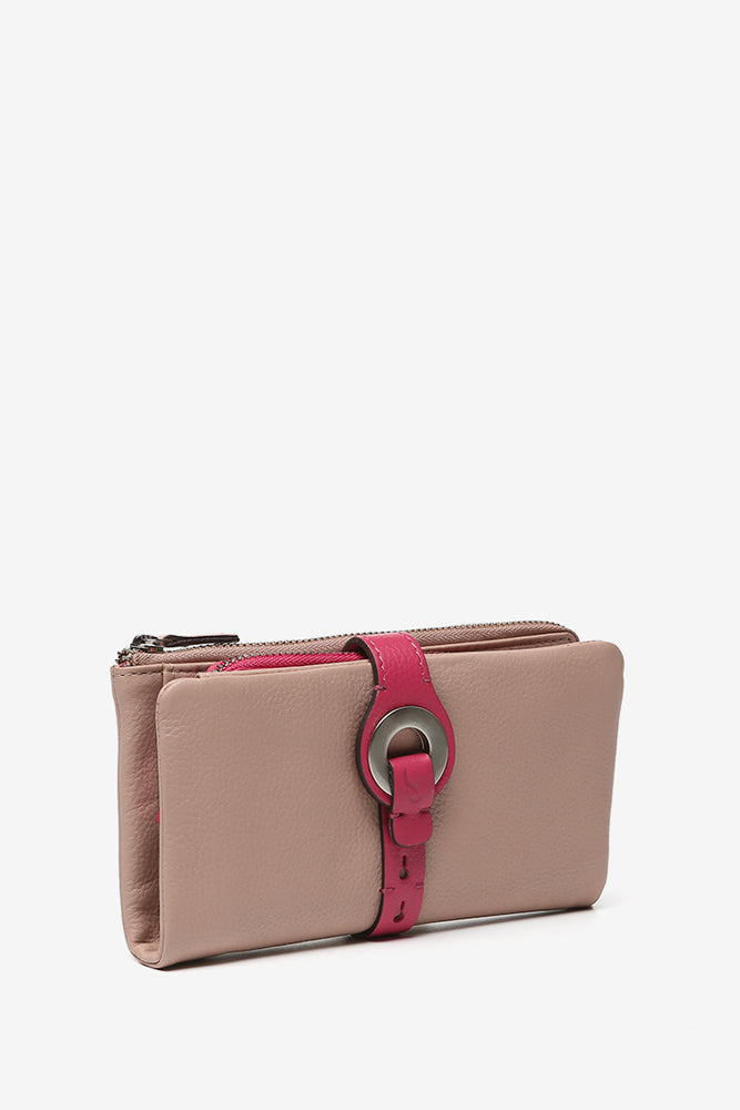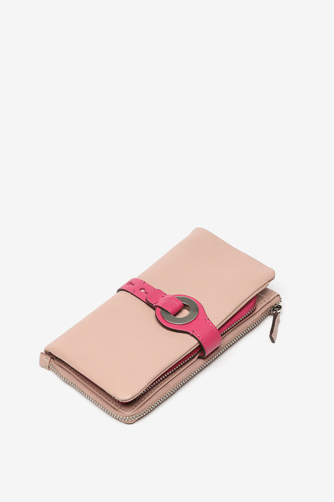 Große Geldbörse mit metallischem Verschluss aus rosa Leder.