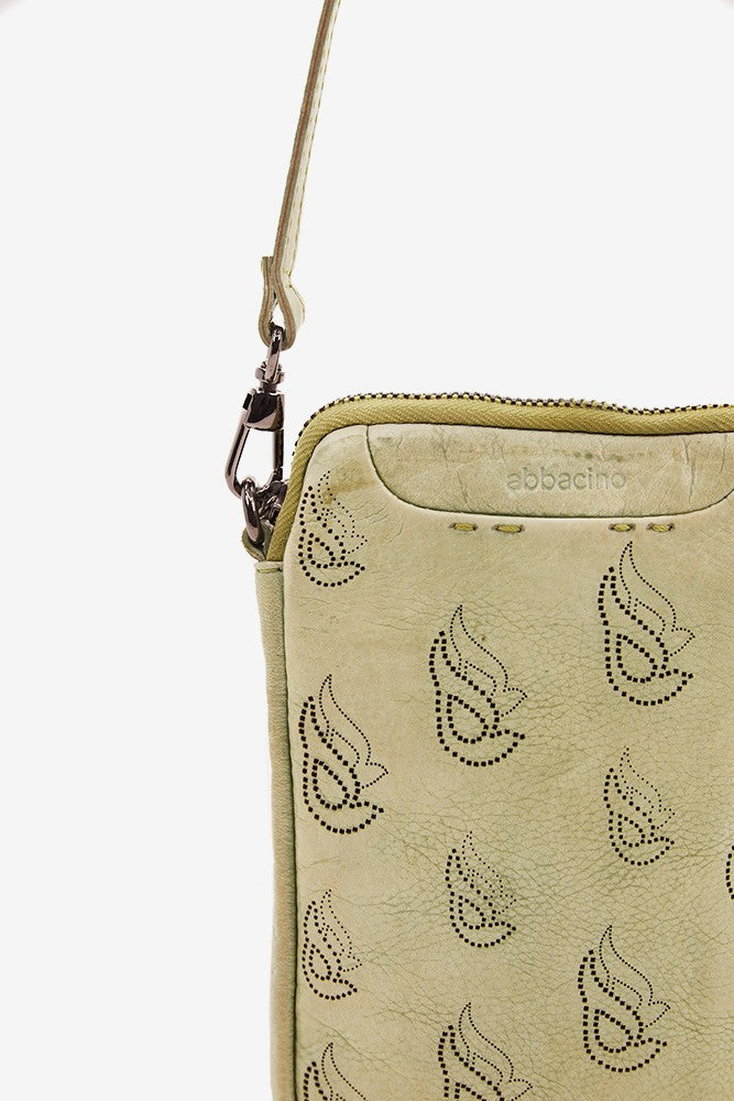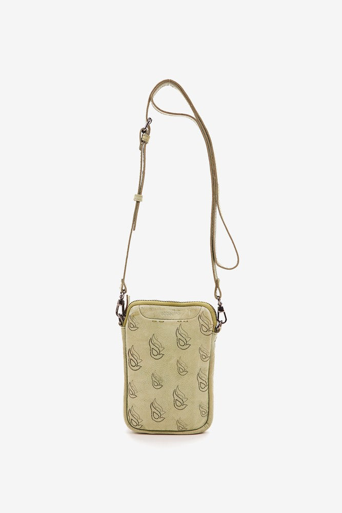 Handytasche aus grünem, gestanztem Leder.