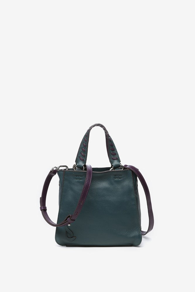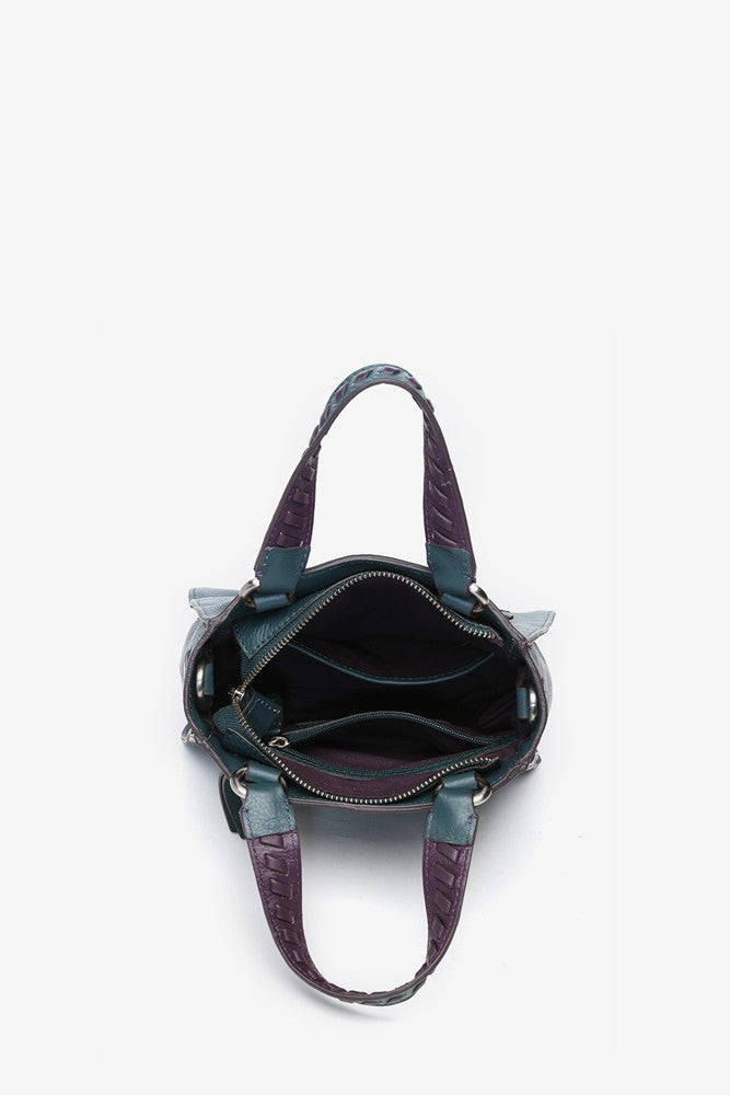 Damentasche aus Premium-Leder. Dieses Design zeichnet sich durch die Kombination von zwei Farbtönen aus: einem Hauptton, der die Tasche färbt, und einer ergänzenden Farbe, die den Schulterriemen und die kleinen Details der Henkel schmückt.