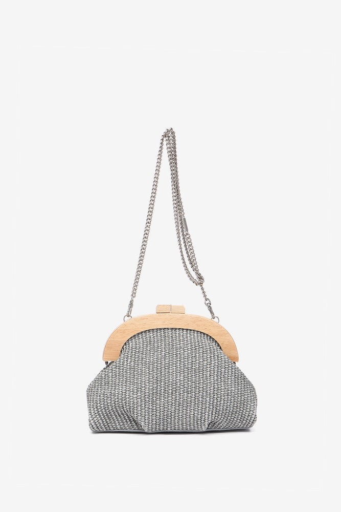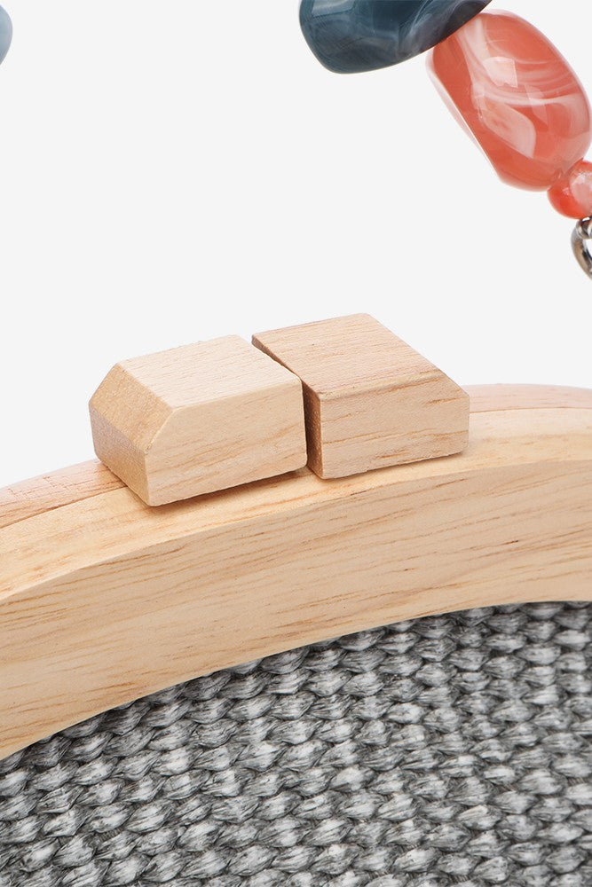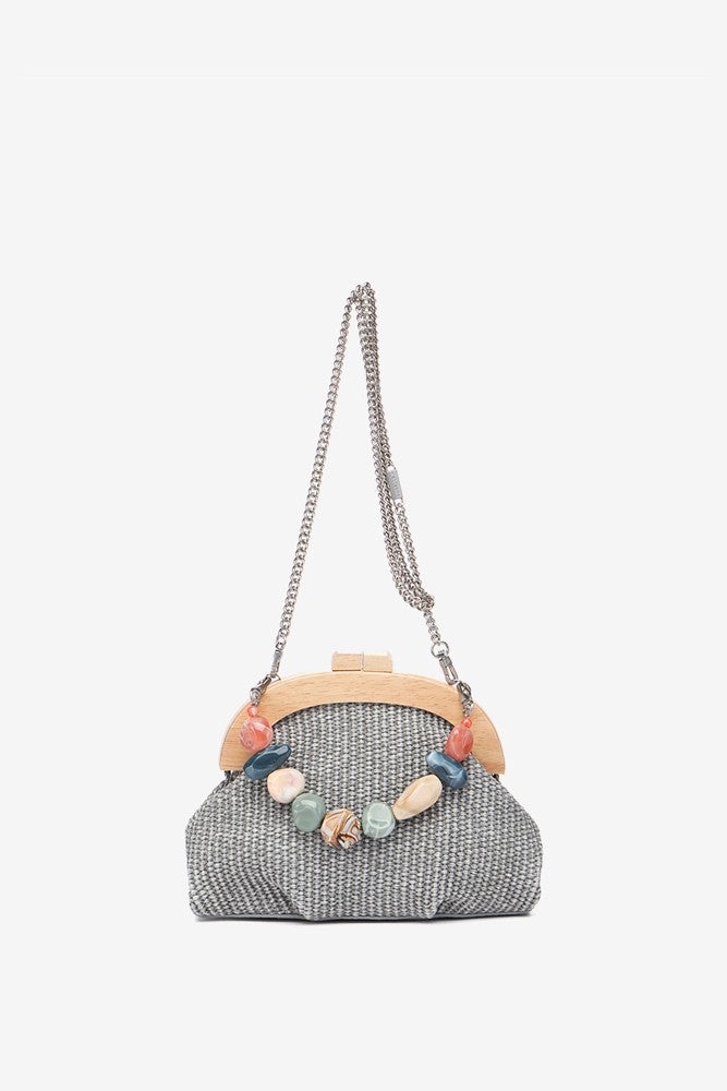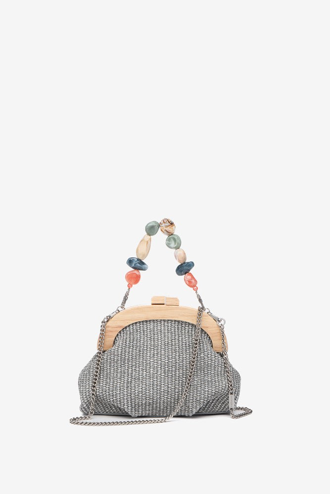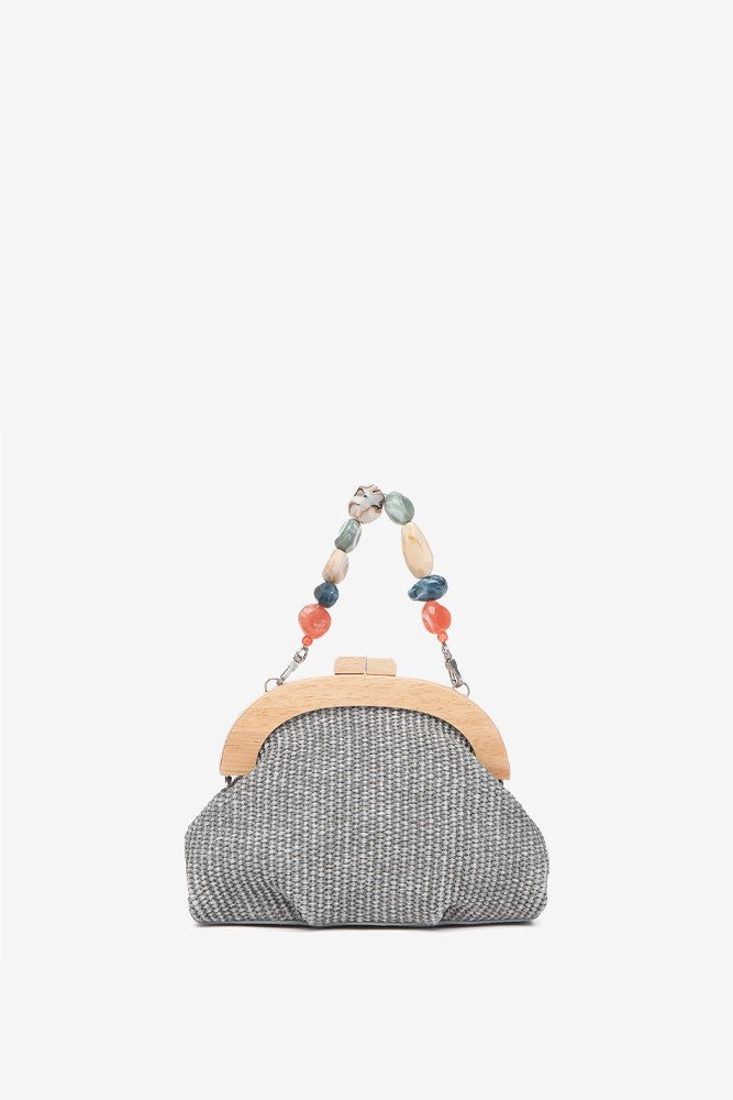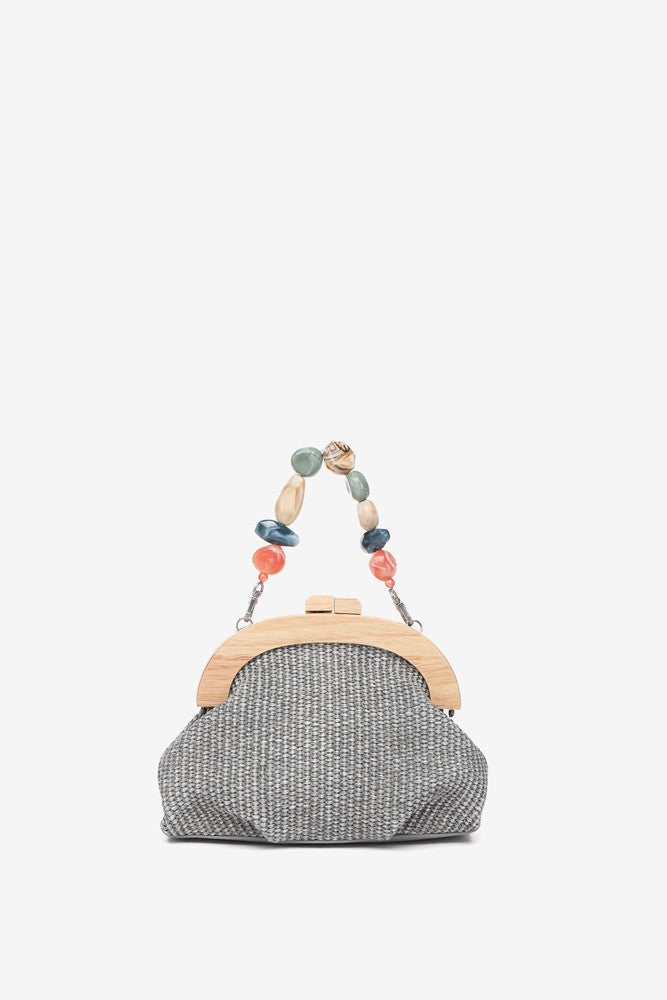 Handtasche aus einer schönen geflochtenen Kombination, Holz und Schmucksteinen. Dieses Modell zeichnet sich durch seine Eleganz und seinen raffinierten Stil aus, ideal, um dich bei besonderen Anlässen zu begleiten. Die Hauptmerkmale sind:
