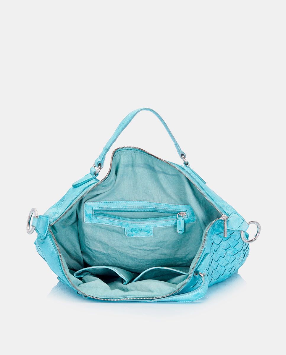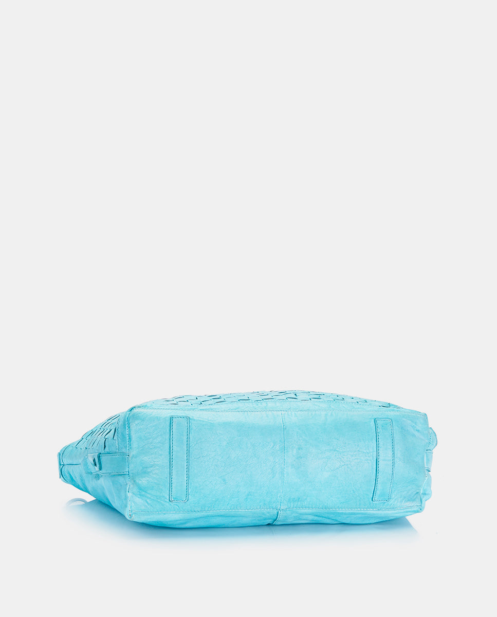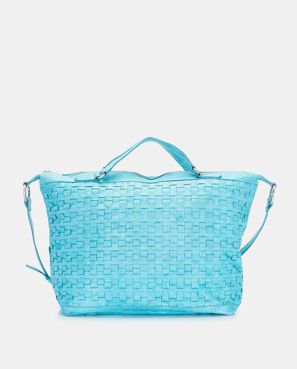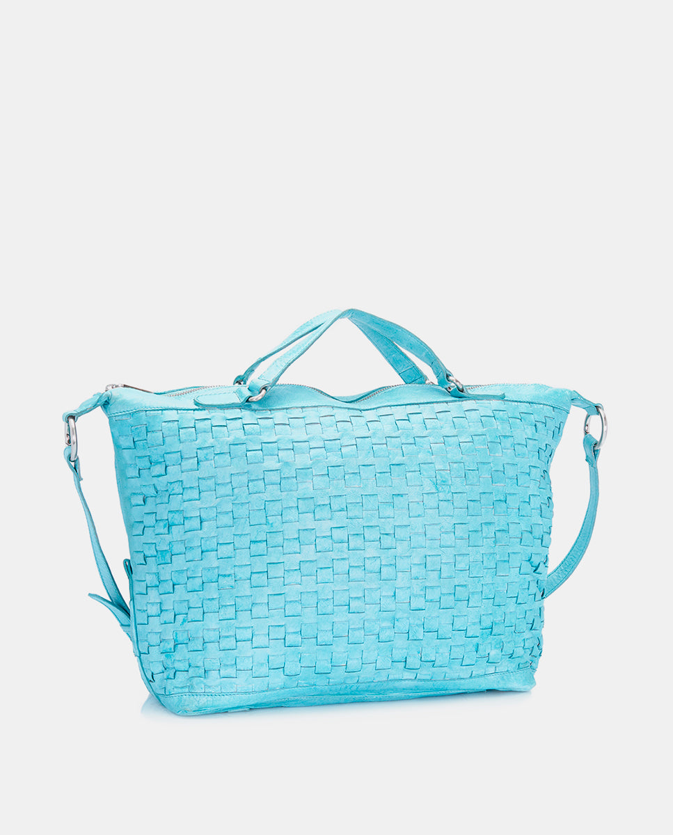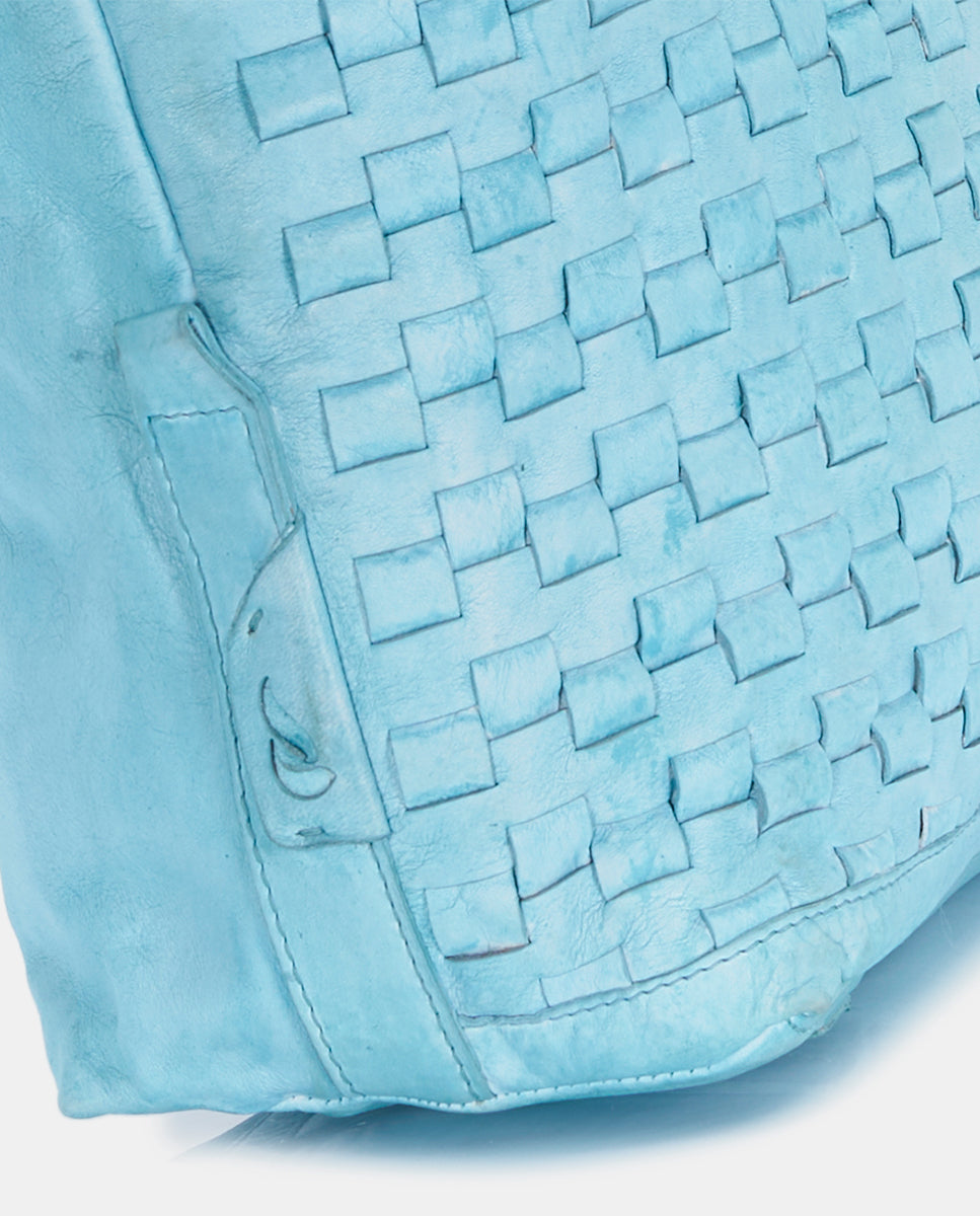 • Kombination aus glattem Leder und handgewebtem Leder.