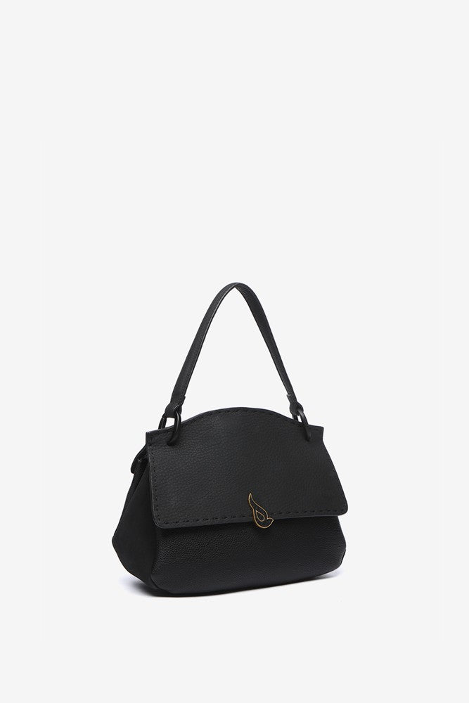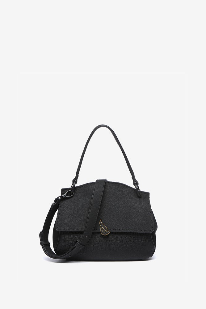Kleine Handtasche aus recycelten schwarzen Materialien.