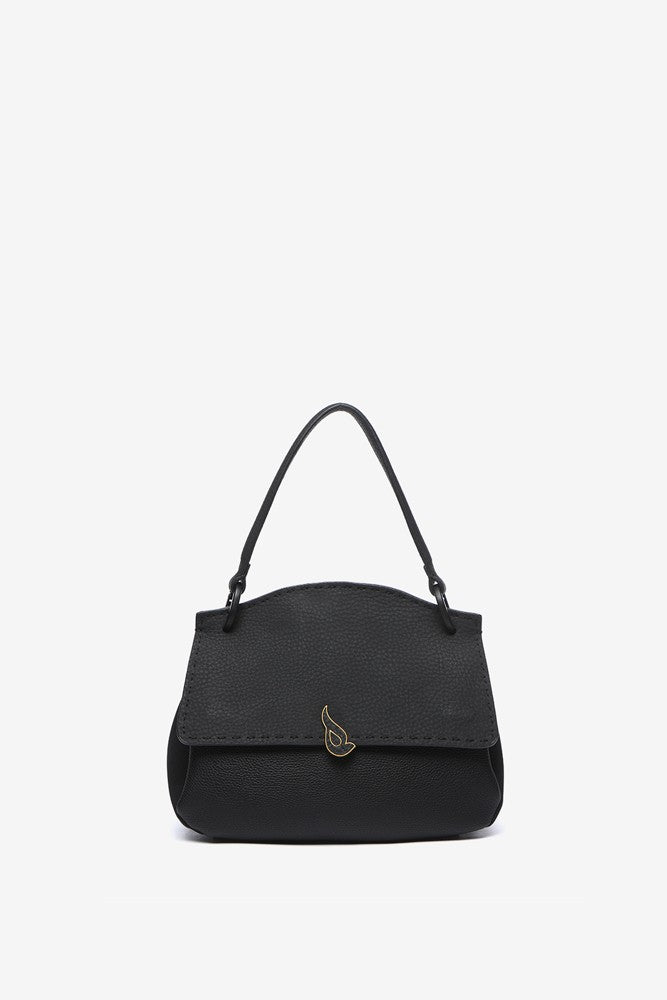 Kleiner Handtasche, hergestellt aus recycelten Materialien. Diese Tasche mit einfachen Linien und kompakter Form ist ein unverzichtbares Basic-Modell für die Herbst- und Wintertage. Ihr Hauptmerkmal ist der Klappenverschluss, auf dessen zentraler Fläche das Logo der Marke hervorsticht.