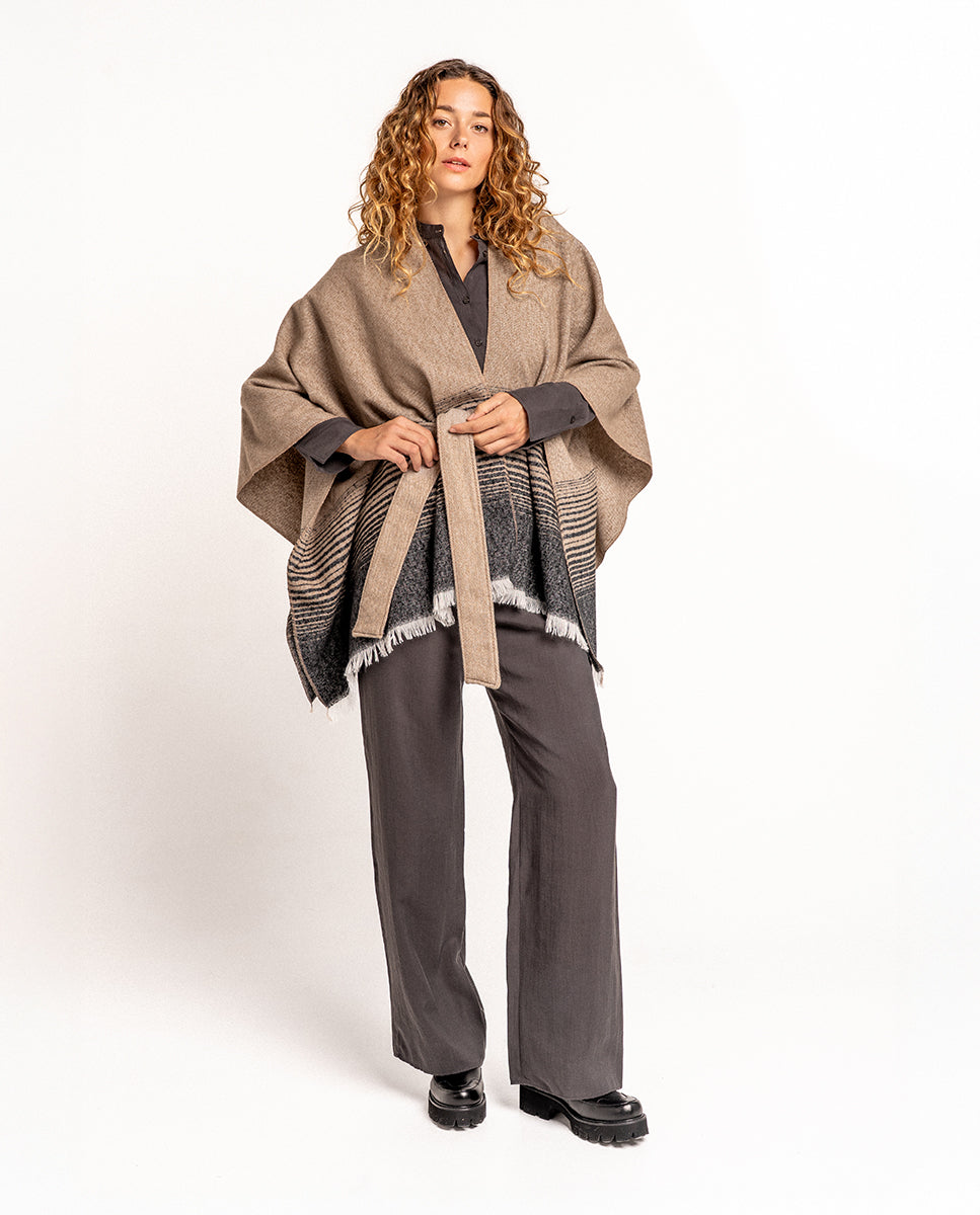 Frauenponcho mit degradierten Brauntönen. Sein Stoff genießt einen ultra -weichen Touch und ist sehr warm, perfekt für Herbst- und Wintertage. Es kann sich durch eine Lazada in die Taille einstellen, wodurch die Silhouette zulässt. Sehr kombinierbar, wird es für kalte Tage ein wesentlicher Bestandteil.
