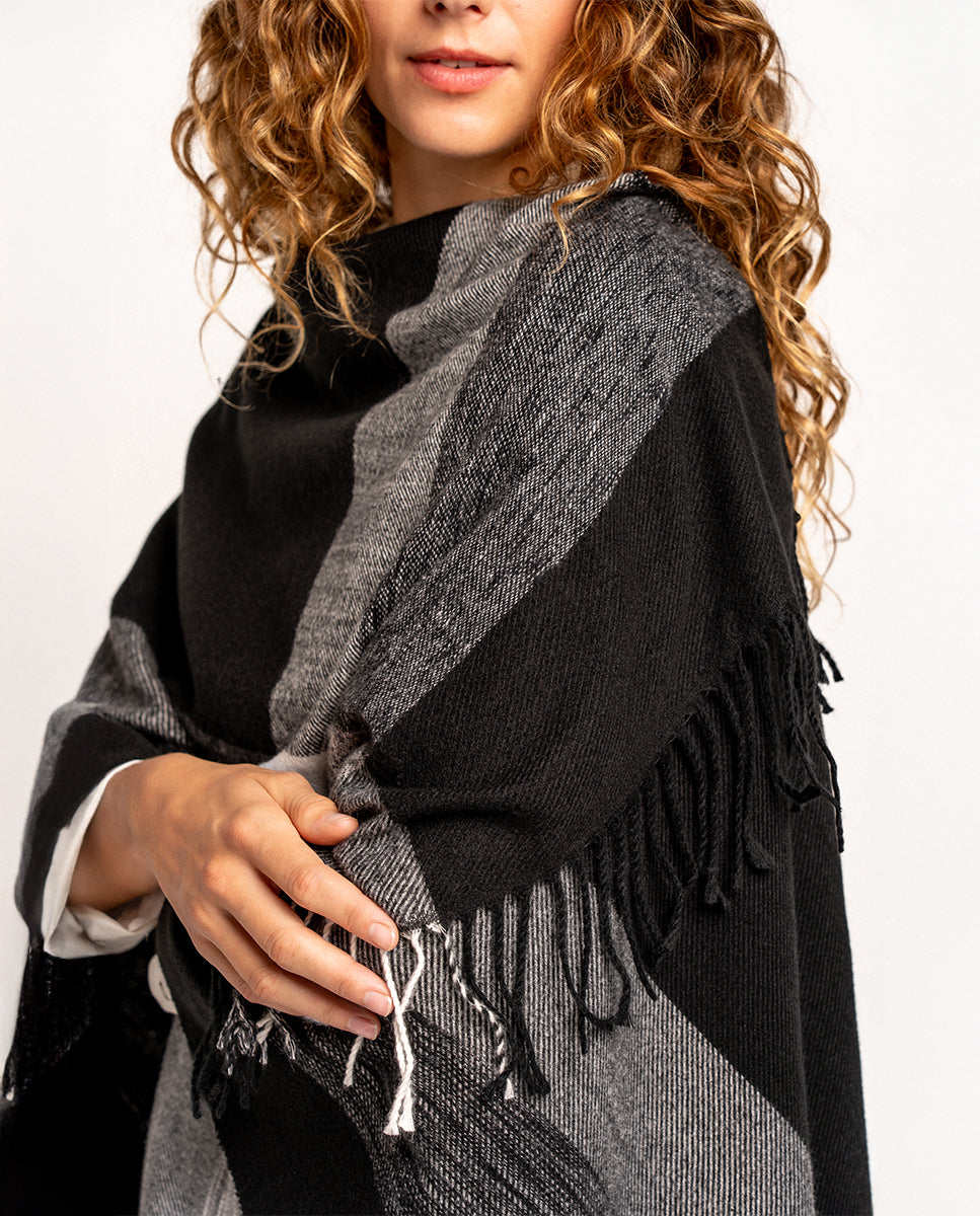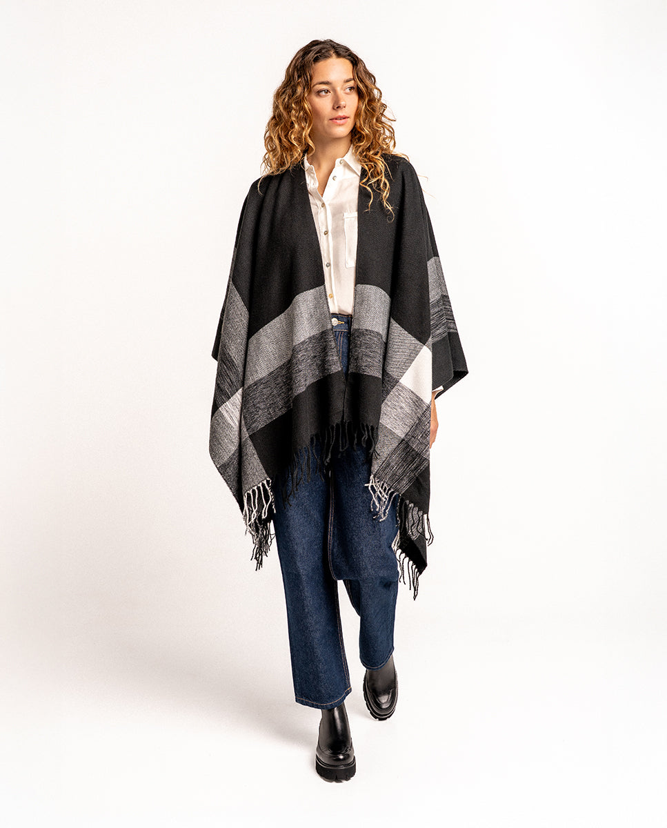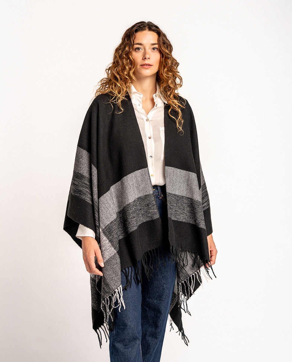Frauenponcho mit gestreiktem Druck, der verschiedene Töne kombiniert. Sein Stoff genießt einen ultra -weichen Touch und ist sehr warm, perfekt für Herbst- und Wintertage. Seine endet mit Rändern, sie bieten eine sehr lässige Luft. Sehr kombinierbar, wird es für kalte Tage ein wesentlicher Bestandteil.