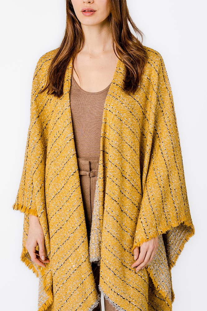 Damenponcho mit gestreiftem, saisonal gefärbtem Muster. Der Stoff hat einen ultraweichen Griff und ist sehr warm, perfekt für die Herbst- und Wintertage. Die fransigen Enden verleihen ihm eine sehr lässige Note. Ein ideales Accessoire, um deinen täglichen Looks einen modernen und frischen Stil zu verleihen.