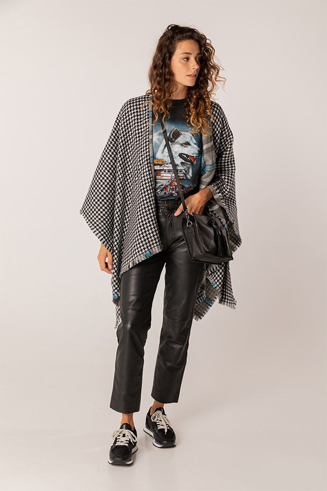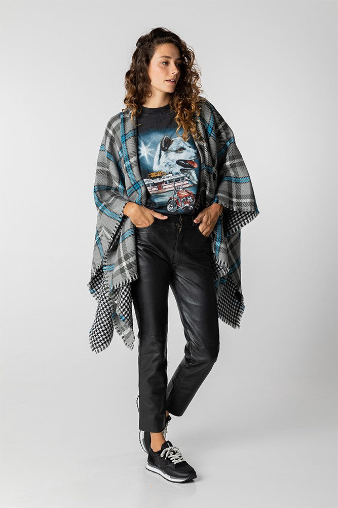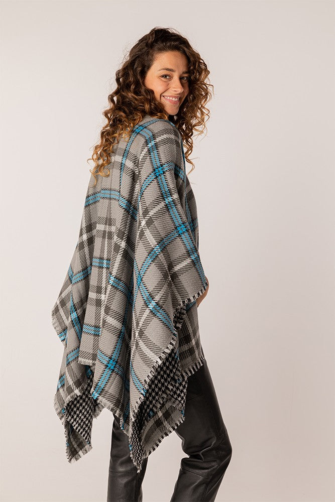 Wendbarer Damen-Poncho aus sehr warmen, lockeren und weich anfühlenden Stoffen, perfekt für die Herbst- und Wintertage. Eine Seite hat ein schönes schottisches Karomuster, die andere ein Hahnentrittmuster. Ein sehr vielseitiges Kleidungsstück, mit dem man unzählige Looks kreieren kann.