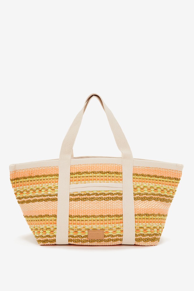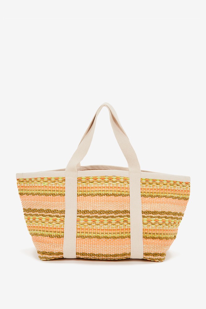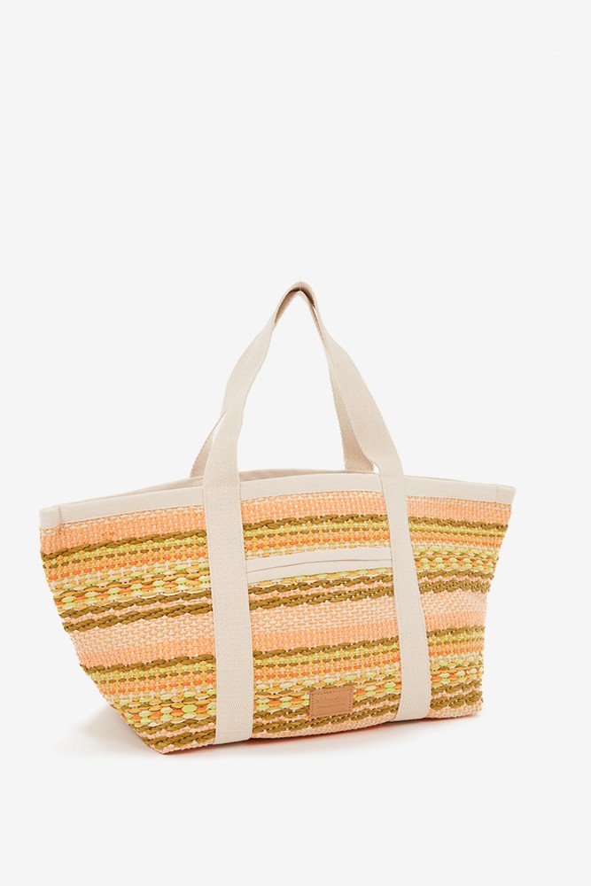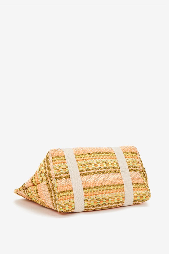 Textil Strandtasche für Frauen im Korb-Stil, entworfen mit einem schönen, mehrfarbigen geflochtenen Stoff. Ein auffälliges und originelles Modell, mit dem du deine lässigsten Strandlooks vervollständigen kannst.
