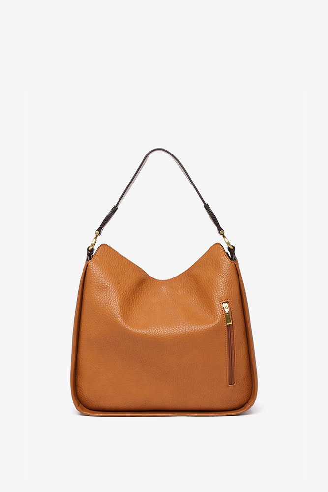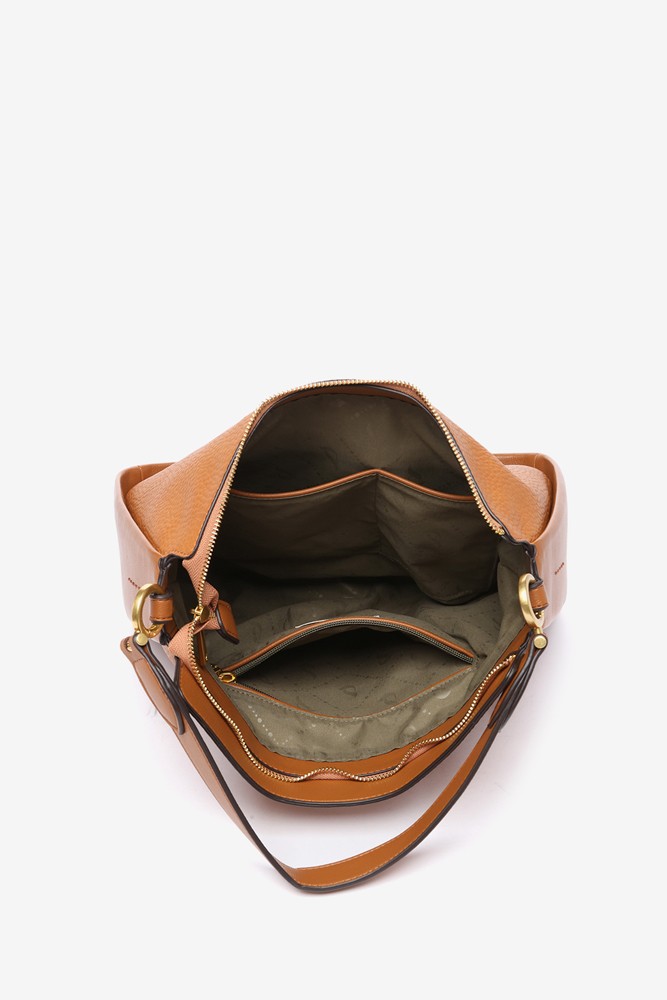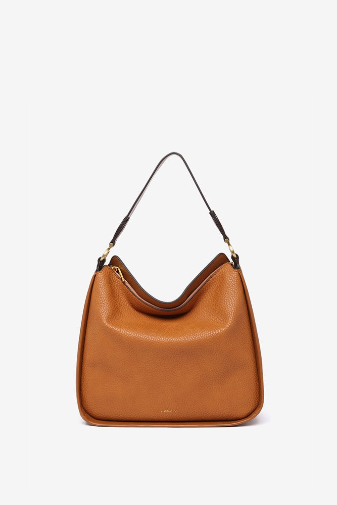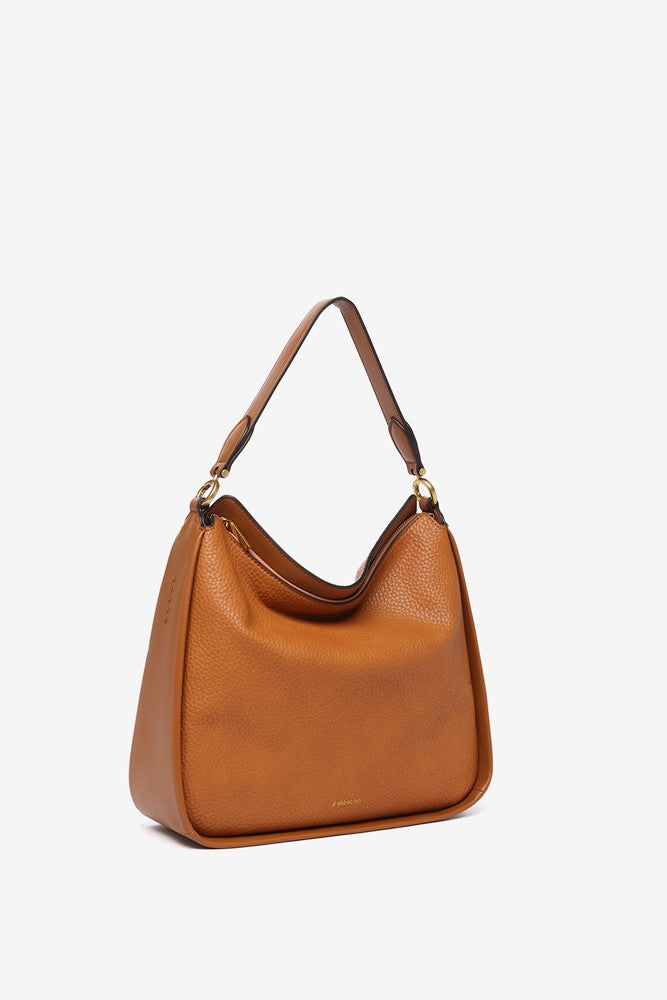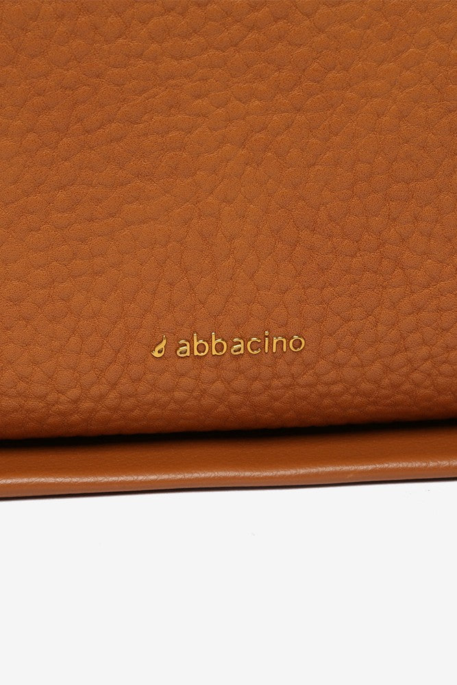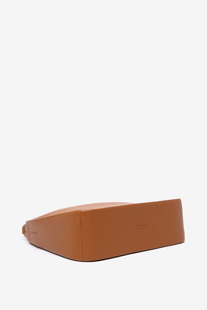 Umhängetasche aus recycelten Materialien in Cognac.