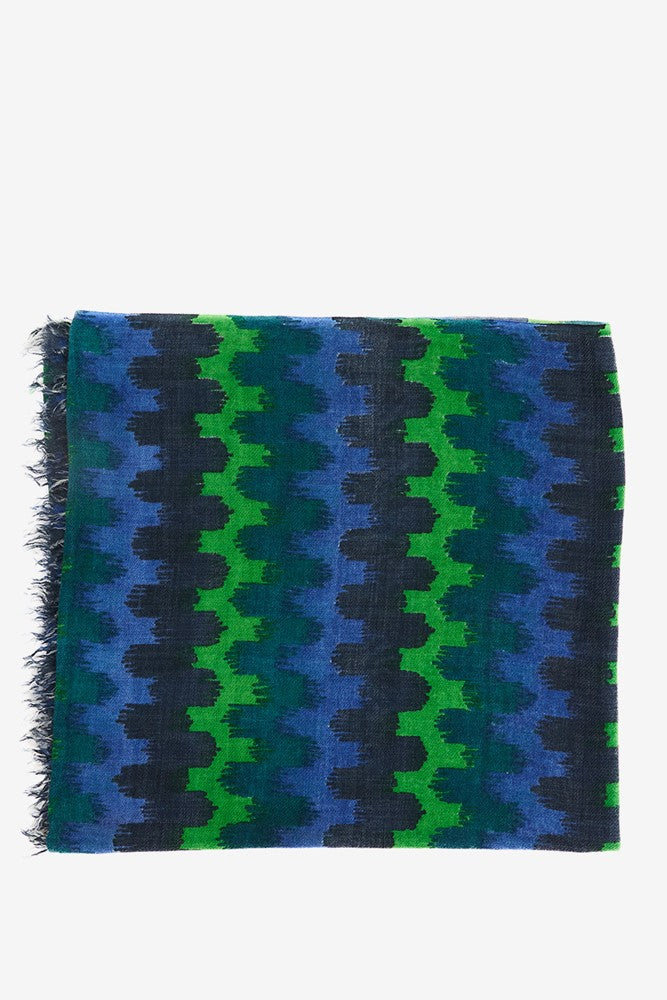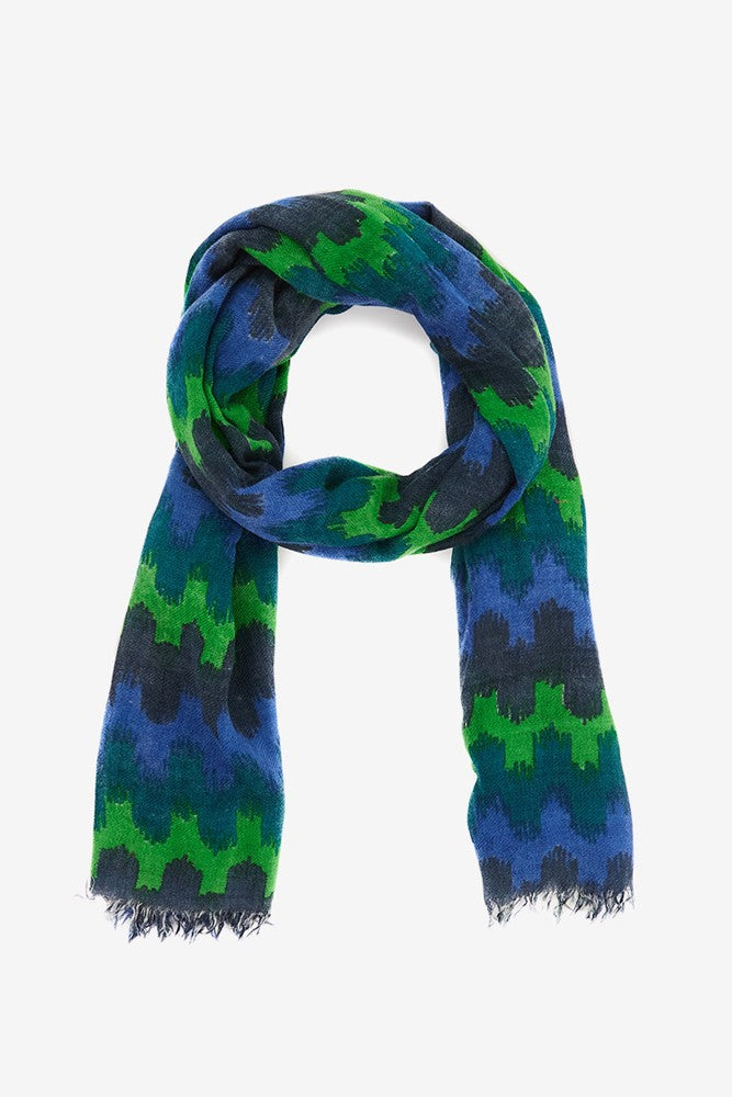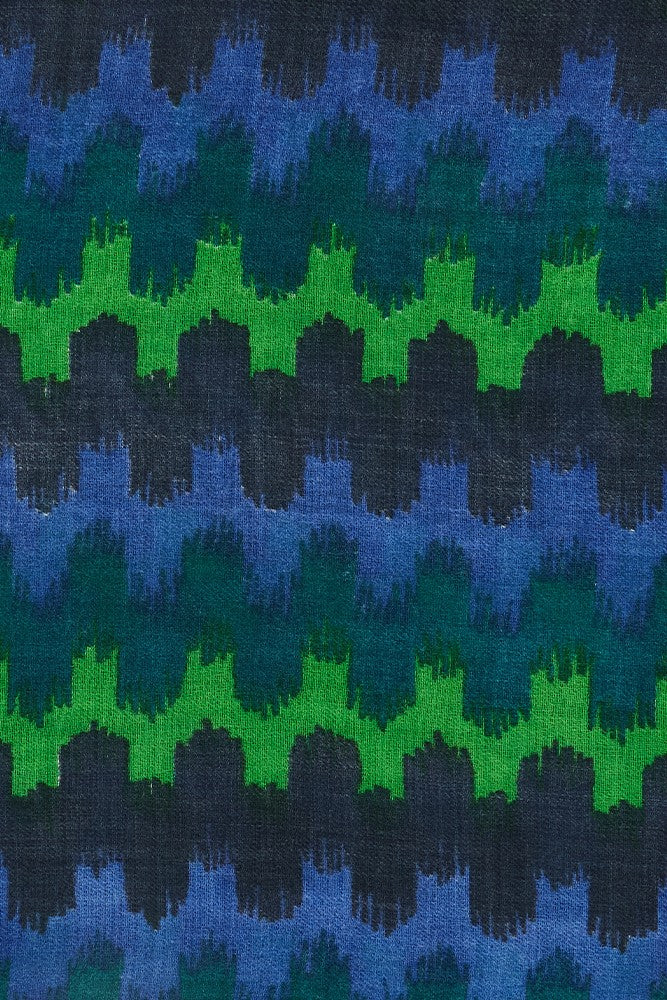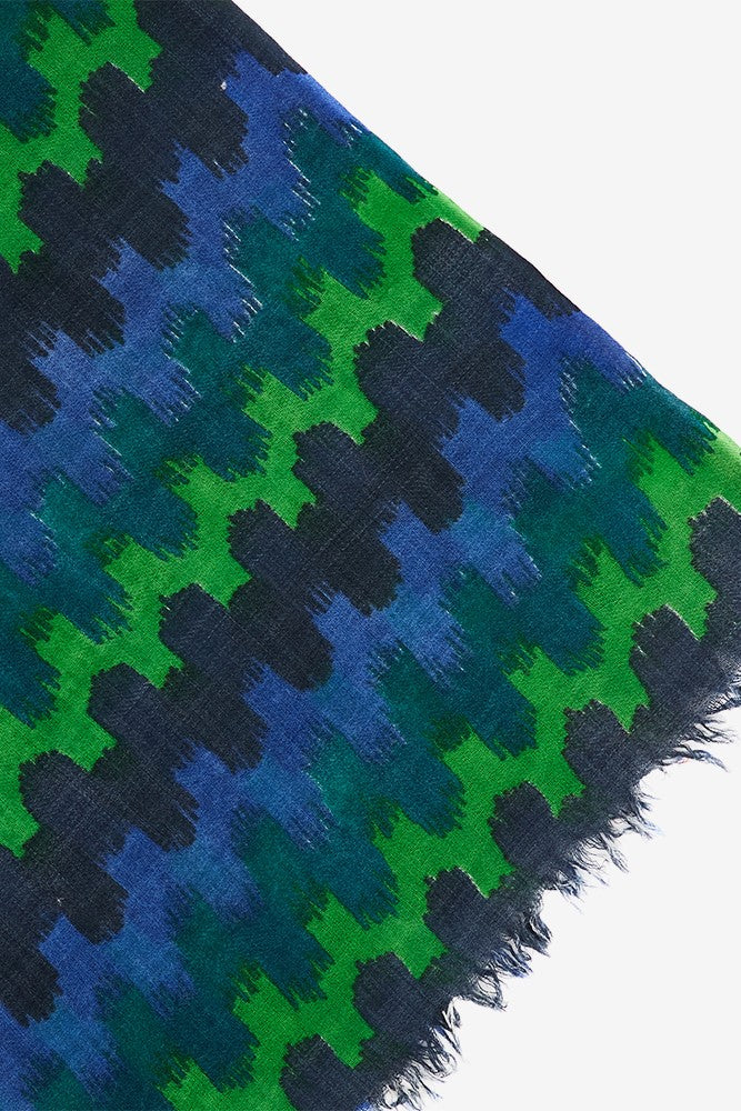 Wollschal mit geometrischem Muster in Blau.